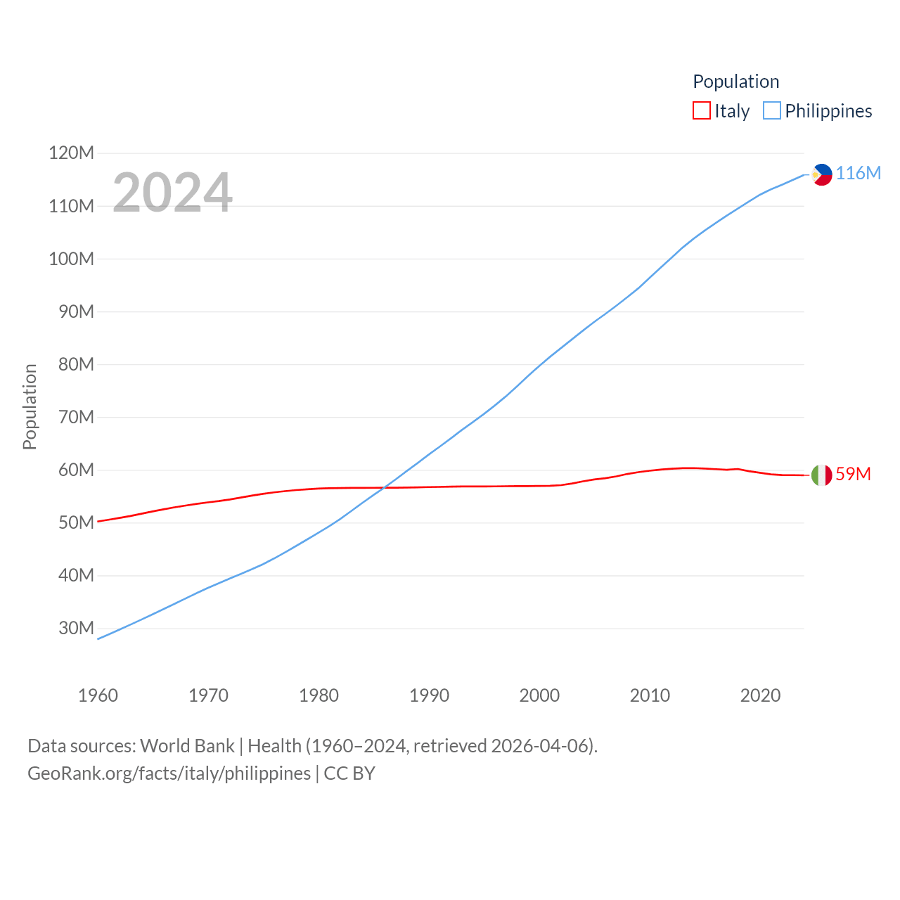 Italy has a population of 59M (ranked 25/197), compared with 116M in The Philippines (ranked 14/197). Italy's land area is 114,178 sq mi versus 115,124 sq mi for The Philippines (ranked 72nd vs. 71st).