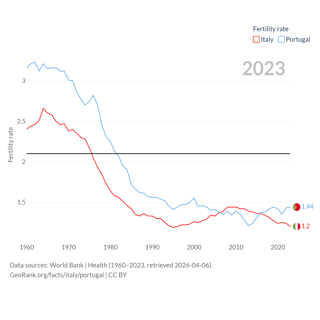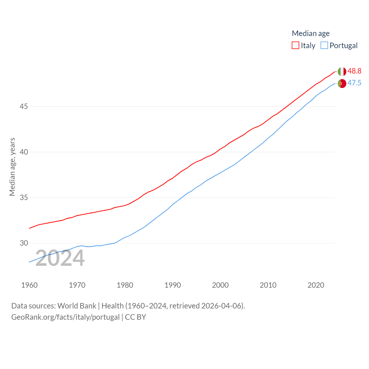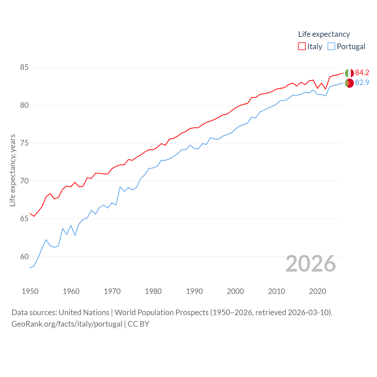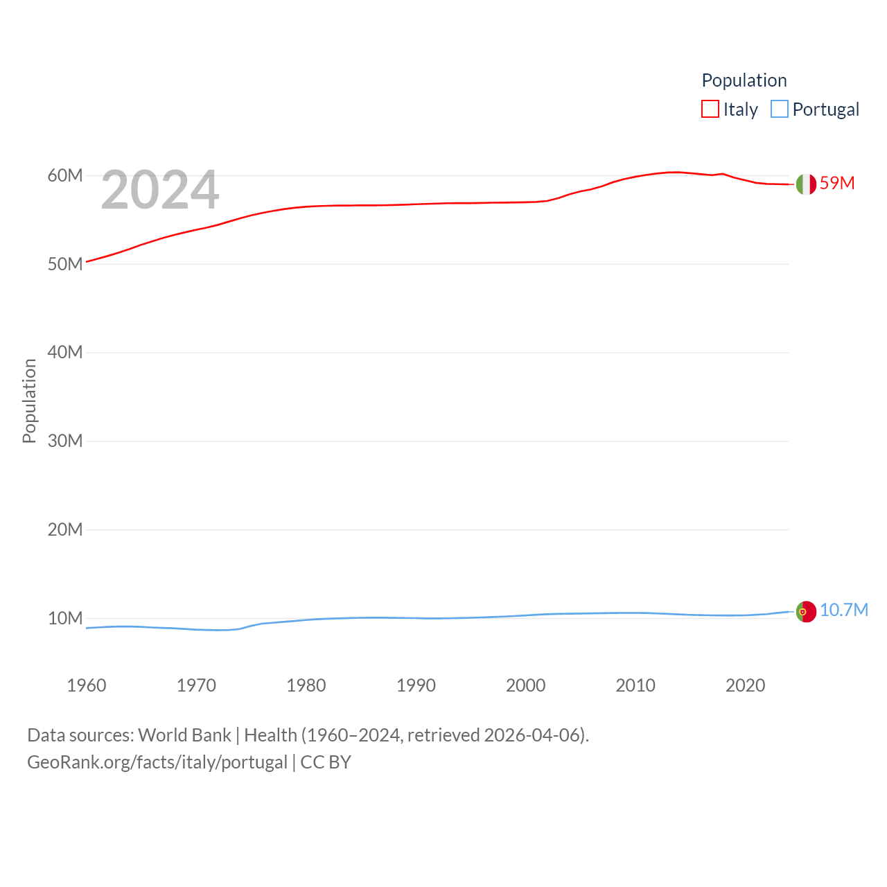 Italy has a population of 59M (ranked 25/197), compared with 10.7M in Portugal (ranked 90/197). Italy's land area is 114,178 sq mi versus 35,369 sq mi for Portugal (ranked 72nd vs. 108th).