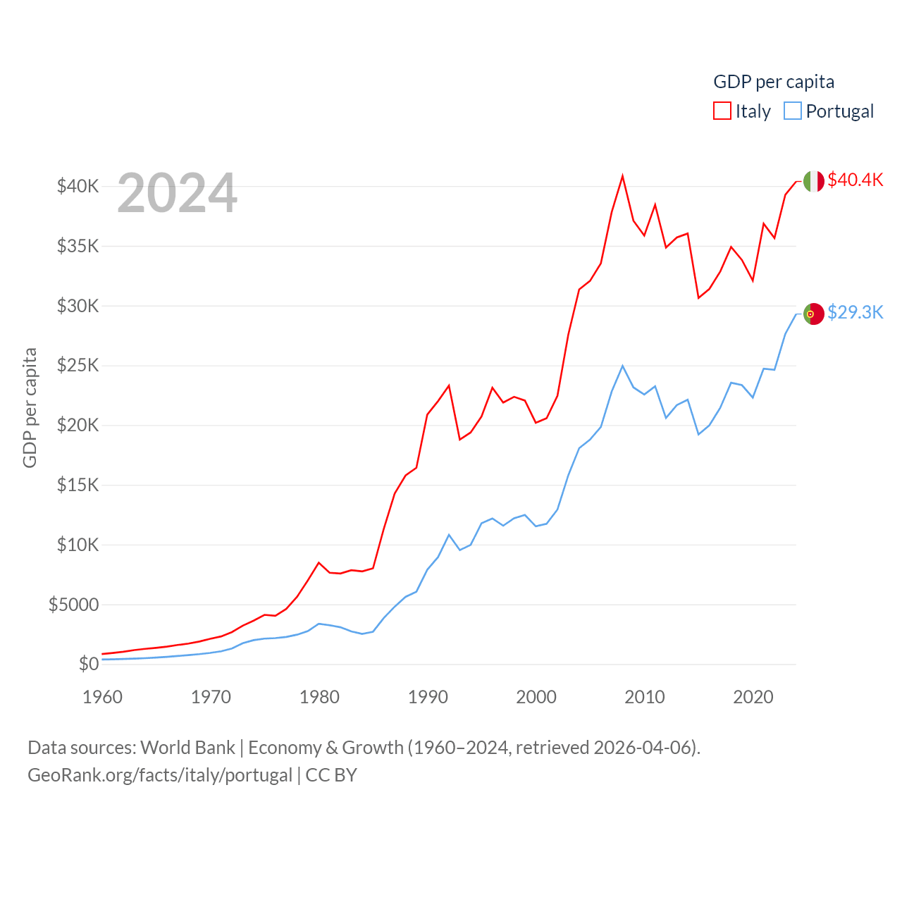 By GDP, Italy ranks 8/197 ($2.38T) and Portugal ranks 46/197 ($313B). By GDP per capita, Italy ranks 29/197 ($40,385), while Portugal ranks 44/197 ($29,292).