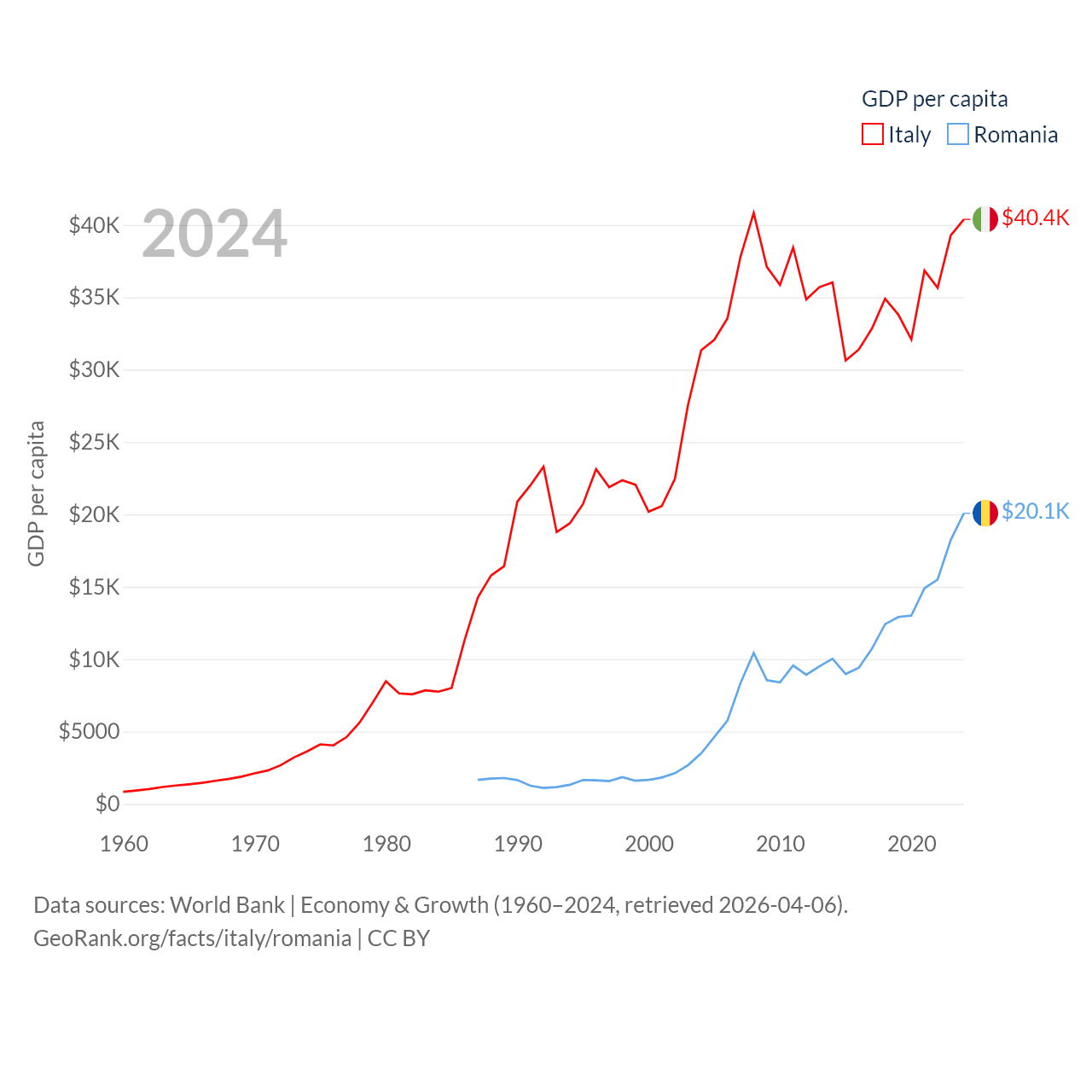 By GDP, Italy ranks 8/197 ($2.38T) and Romania ranks 42/197 ($383B). By GDP per capita, Italy ranks 29/197 ($40,385), while Romania ranks 58/197 ($20,080).