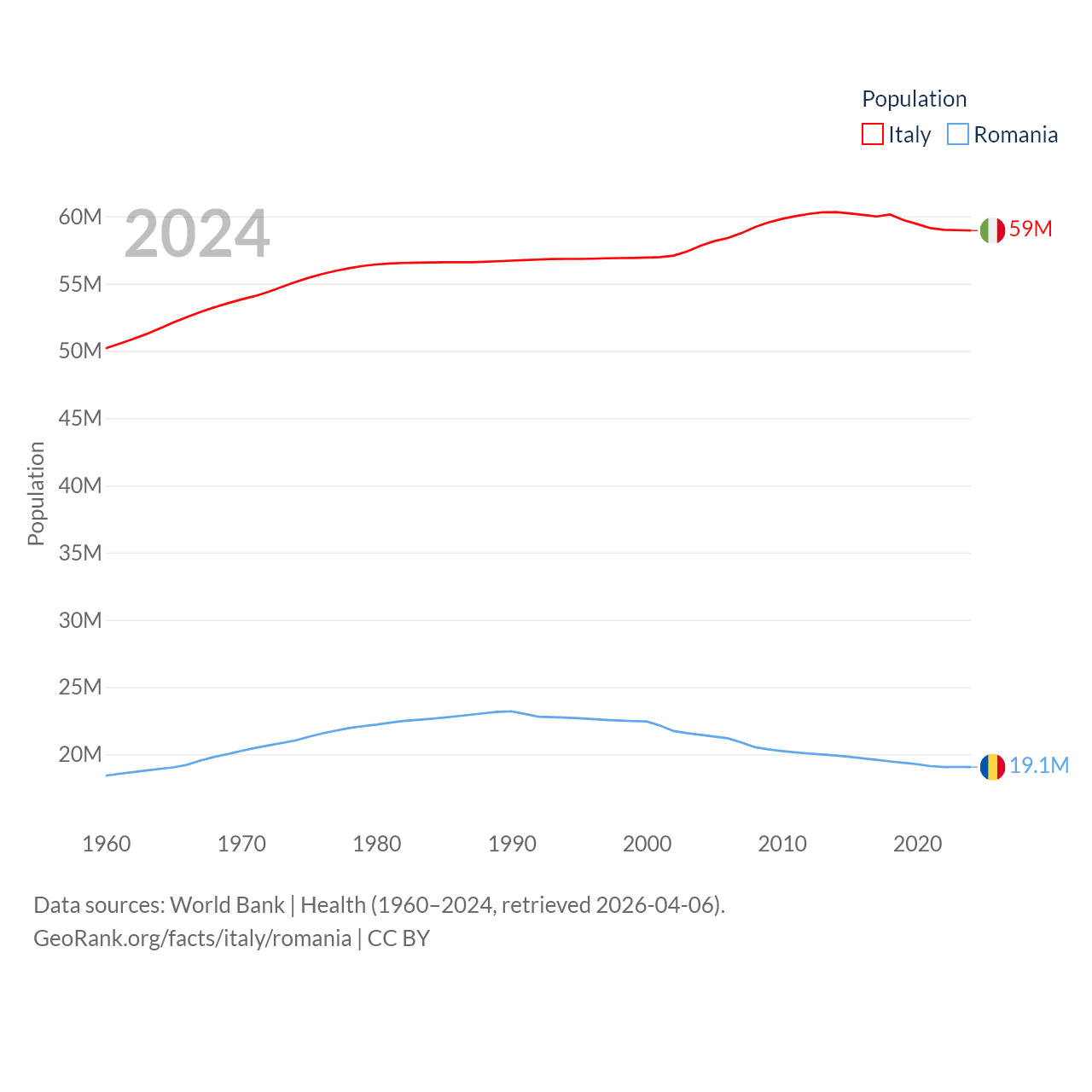 Italy has a population of 59M (ranked 25/197), compared with 19.1M in Romania (ranked 67/197). Italy's land area is 114,178 sq mi versus 88,834 sq mi for Romania (ranked 72nd vs. 80th).