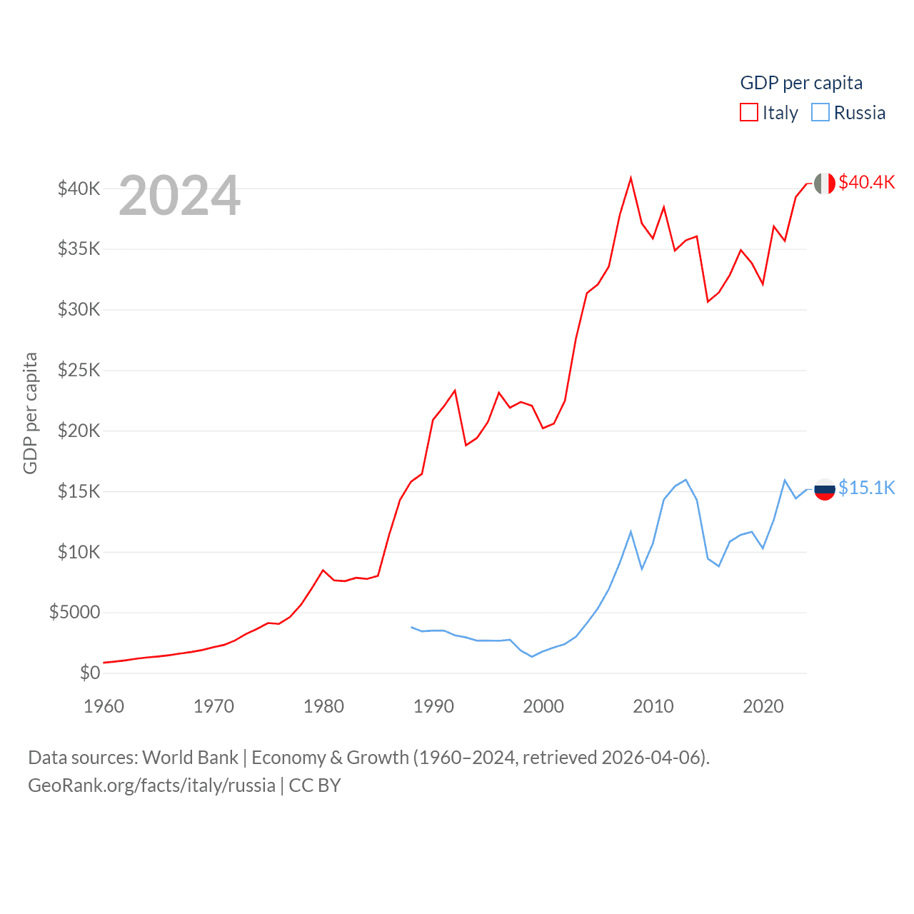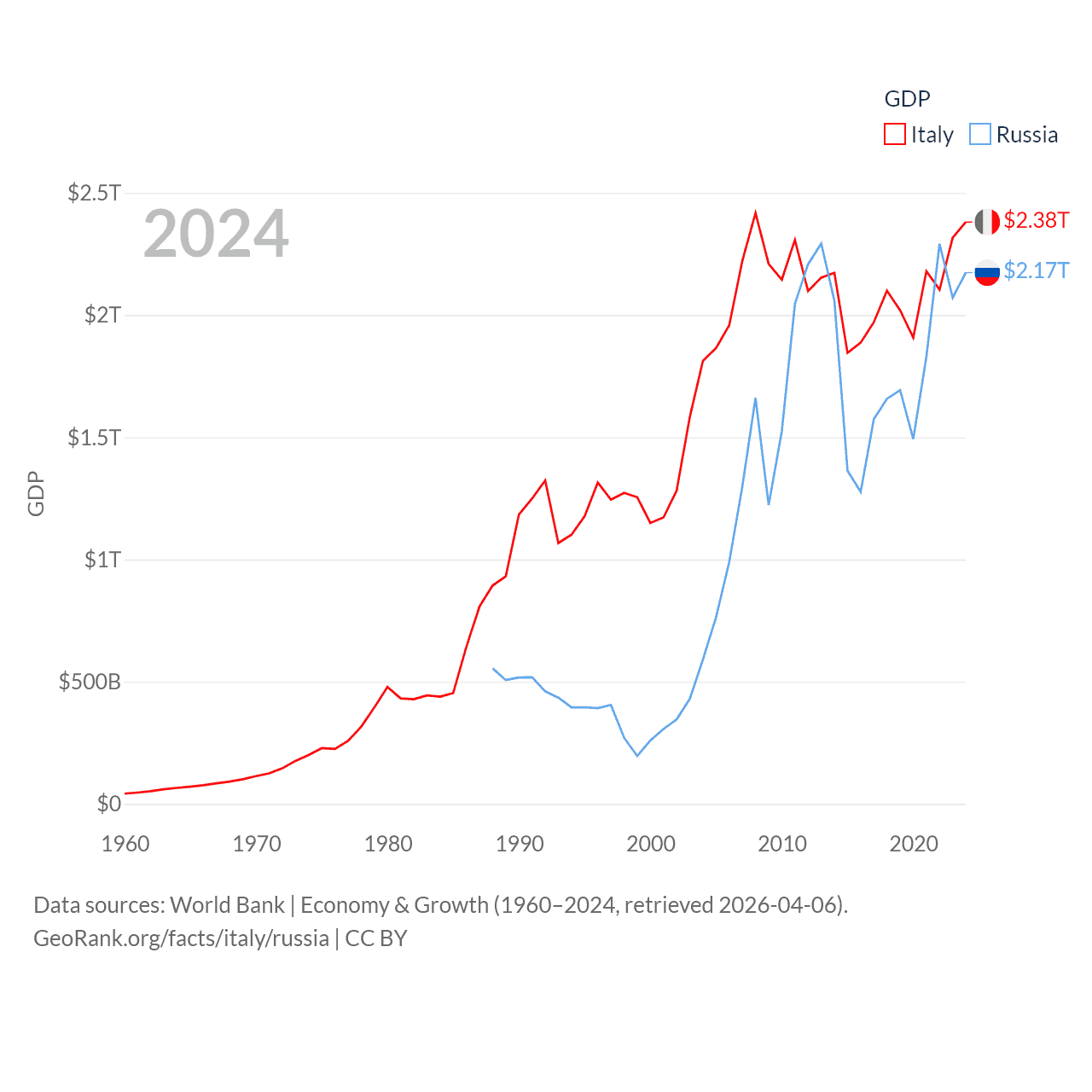By GDP, Italy ranks 8/197 ($2.38T) and Russia ranks 11/197 ($2.17T). By GDP per capita, Italy ranks 29/197 ($40,385), while Russia ranks 68/197 ($15,145).