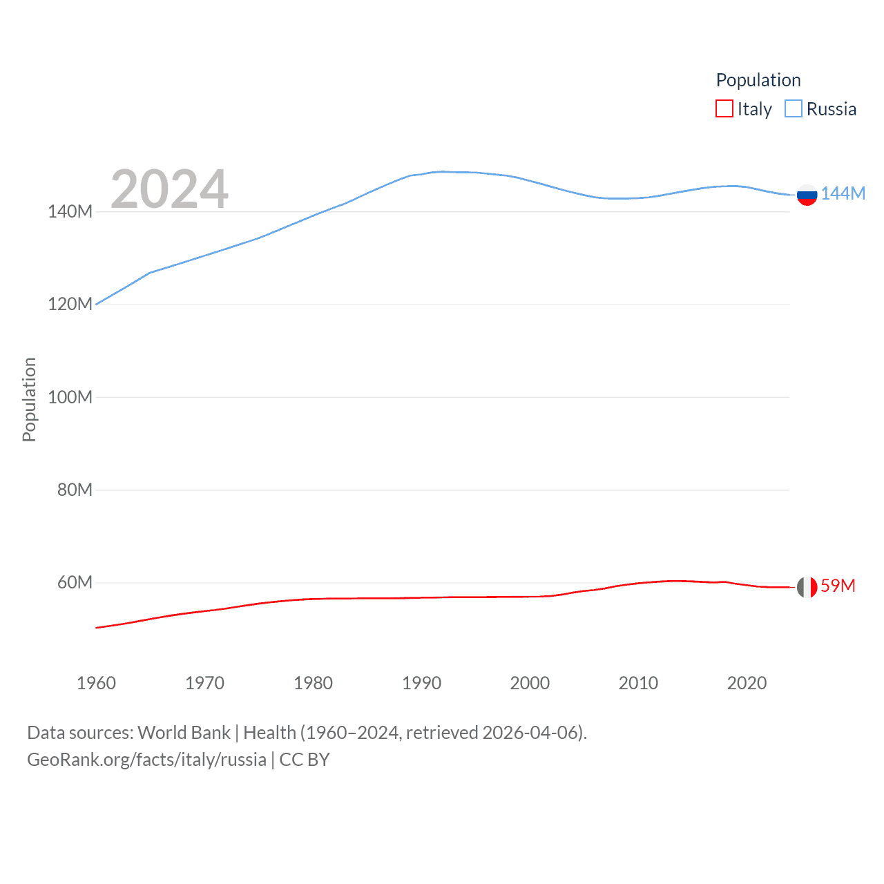 Italy has a population of 59M (ranked 25/197), compared with 144M in Russia (ranked 9/197). Italy's land area is 114,178 sq mi versus 6,323,145 sq mi for Russia (ranked 72nd vs. 1st).