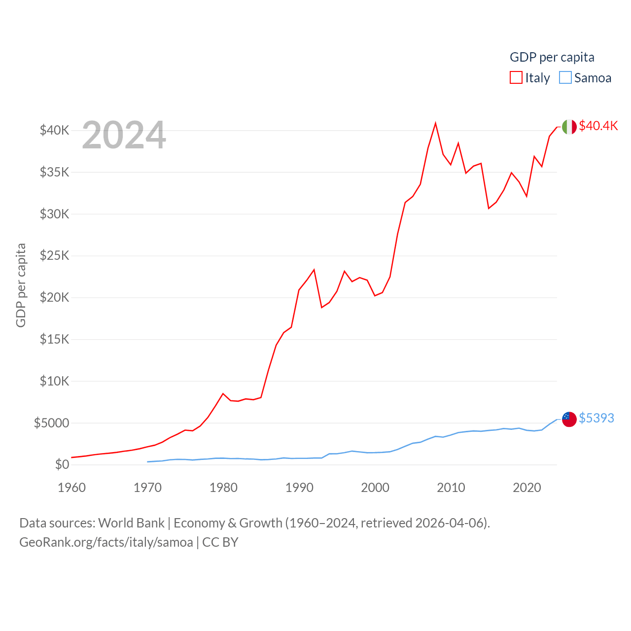 By GDP, Italy ranks 8/197 ($2.38T) and Samoa ranks 185/197 ($1.18B). By GDP per capita, Italy ranks 29/197 ($40,385), while Samoa ranks 117/197 ($5,393).