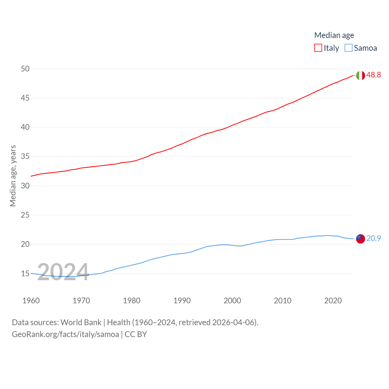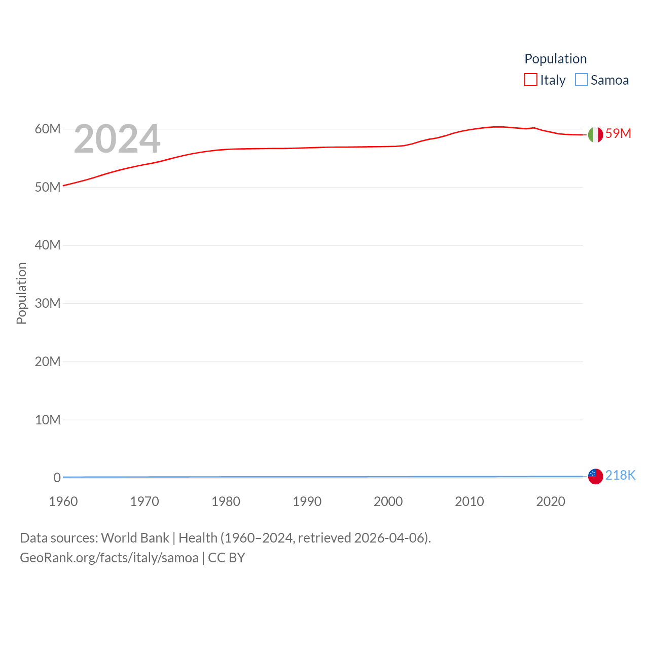 Italy has a population of 59M (ranked 25/197), compared with 218K in Samoa (ranked 177/197). Italy's land area is 114,178 sq mi versus 1,073 sq mi for Samoa (ranked 72nd vs. 168th).