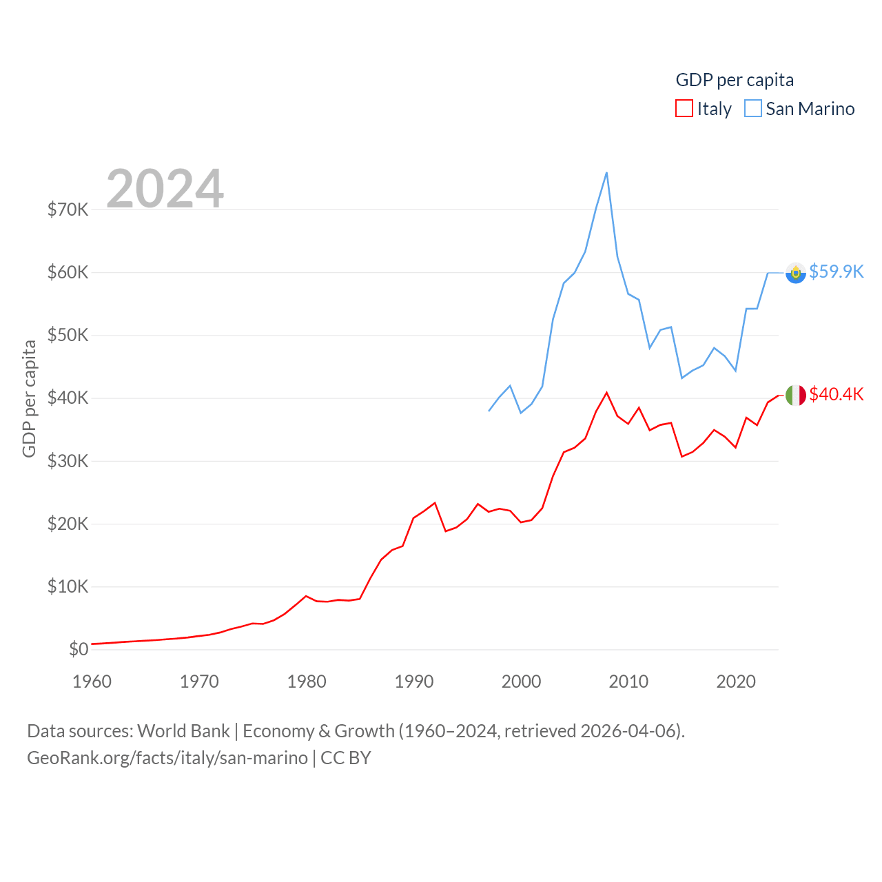 By GDP, Italy ranks 8/197 ($2.38T) and San Marino ranks 180/197 ($2.03B). By GDP per capita, Italy ranks 29/197 ($40,385), while San Marino ranks 15/197 ($59,880).