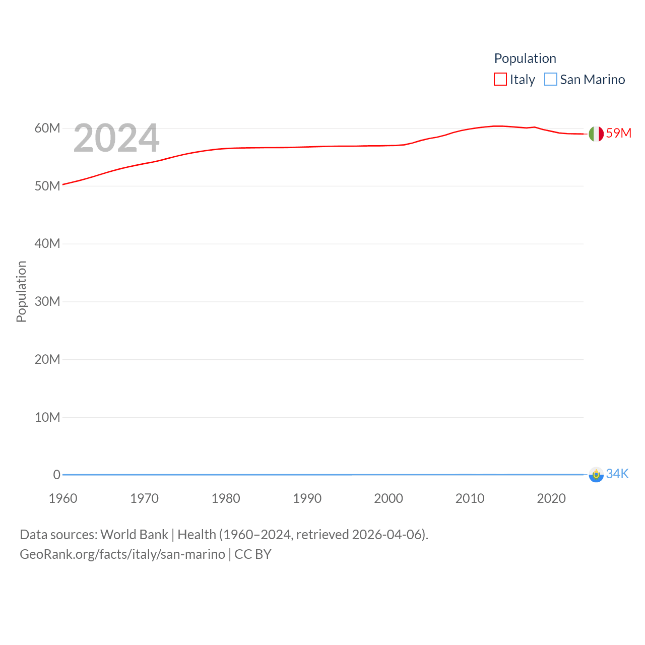 Italy has a population of 59M (ranked 25/197), compared with 34K in San Marino (ranked 193/197). Italy's land area is 114,178 sq mi versus 23.2 sq mi for San Marino (ranked 72nd vs. 193rd).