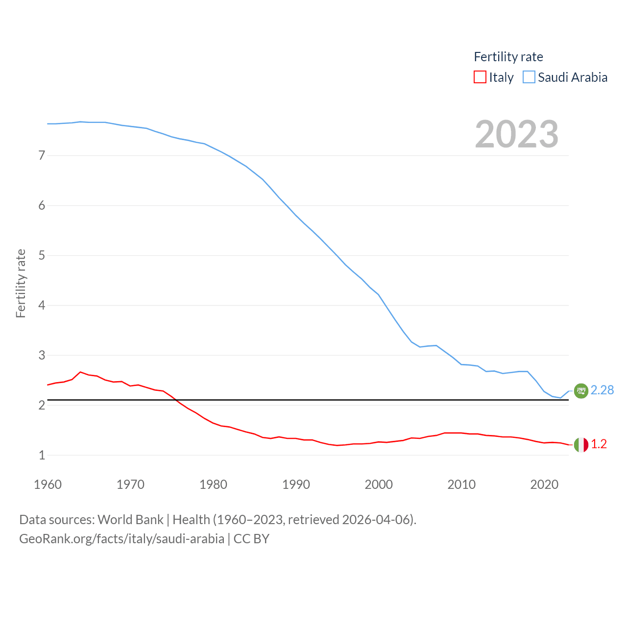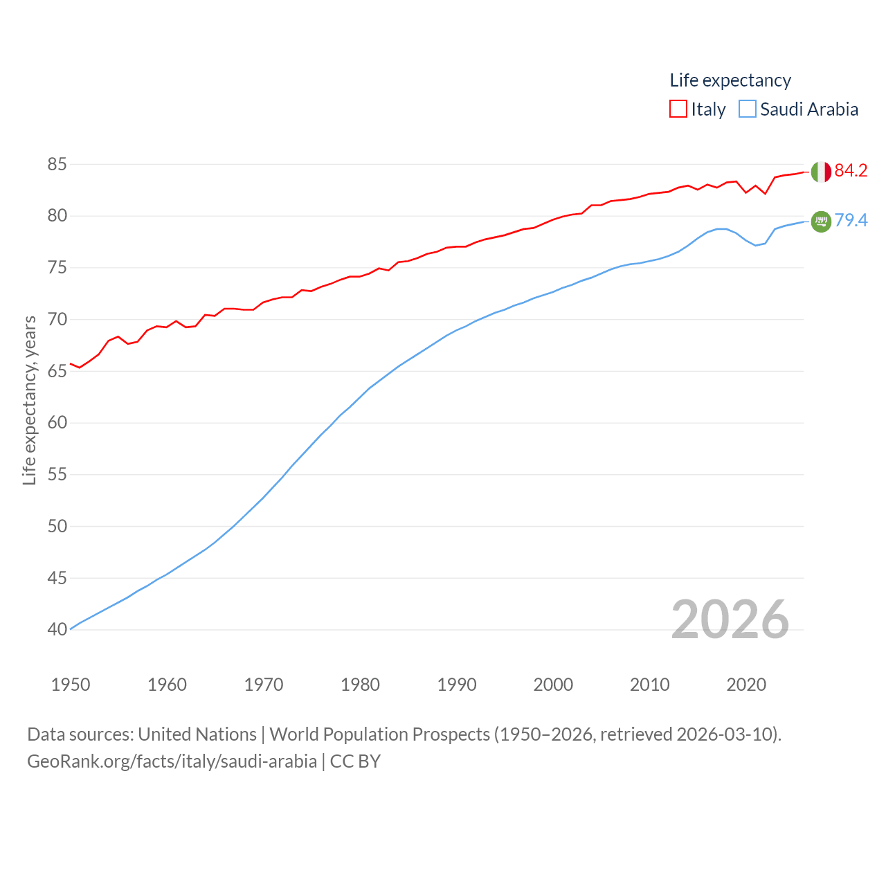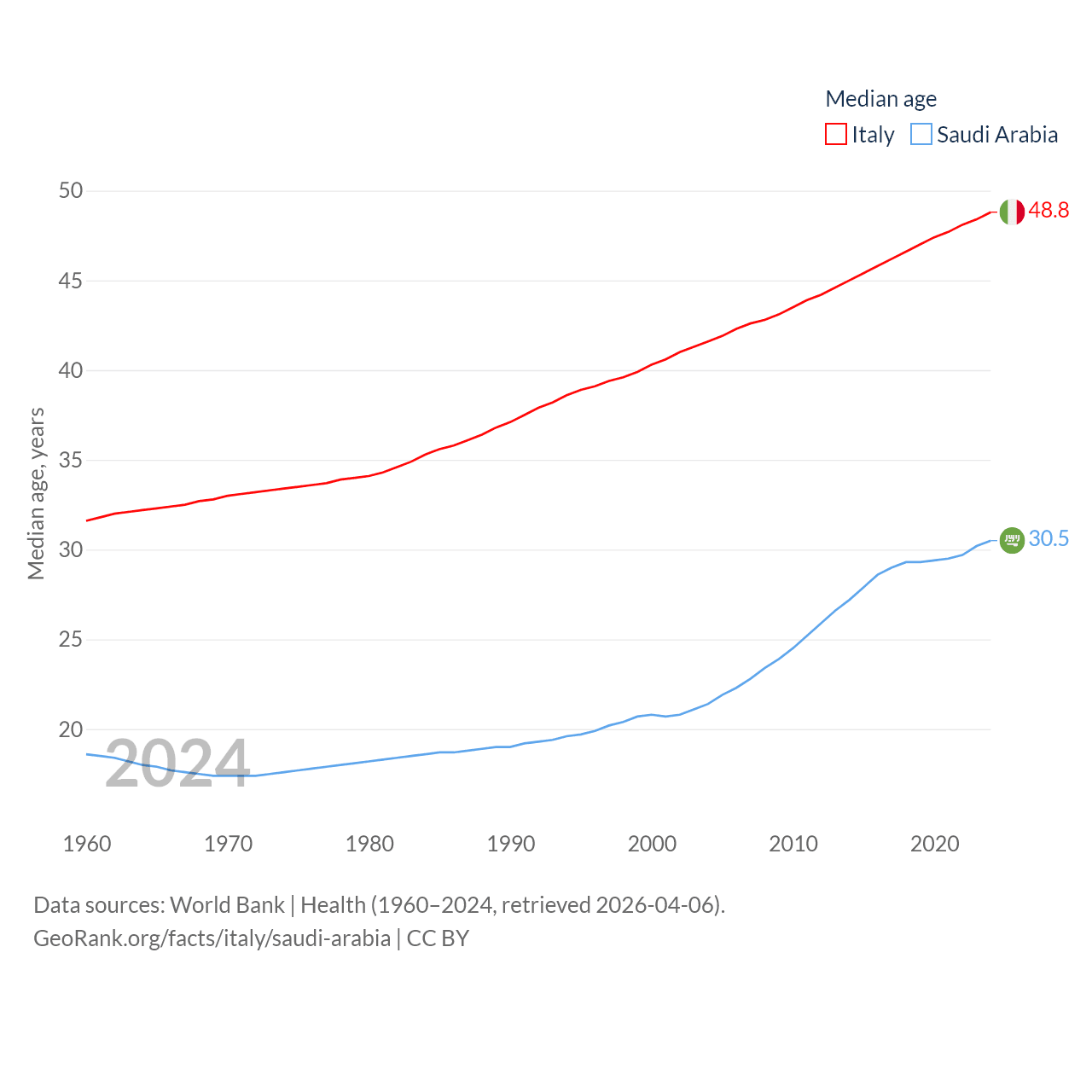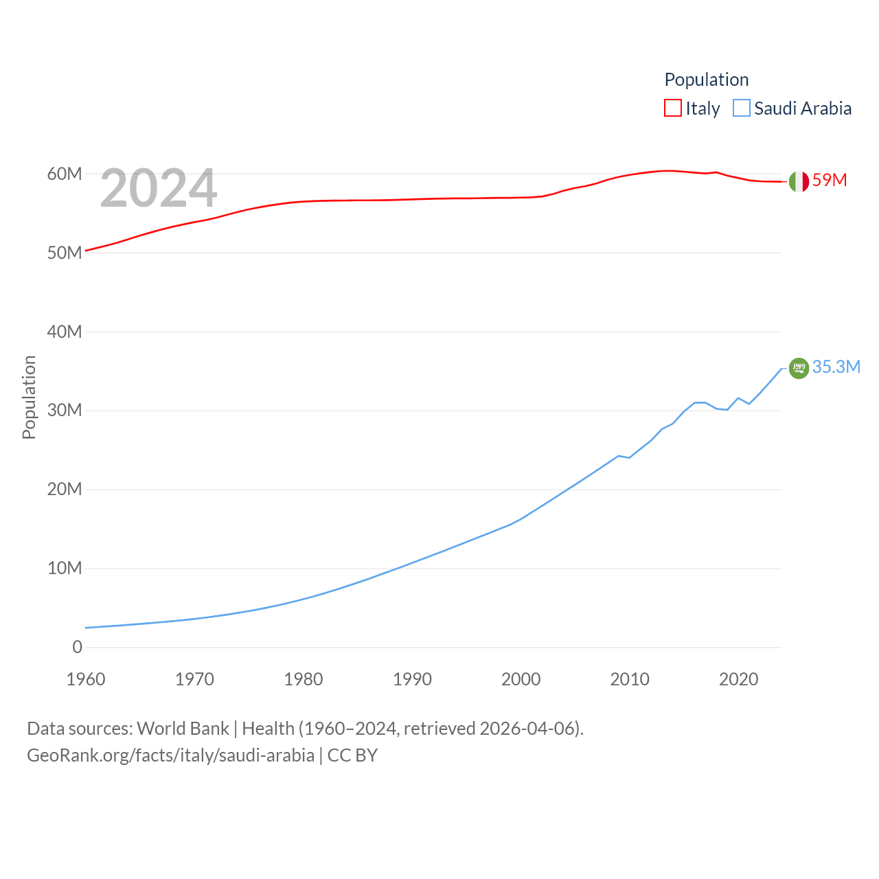 Italy has a population of 59M (ranked 25/197), compared with 35.3M in Saudi Arabia (ranked 45/197). Italy's land area is 114,178 sq mi versus 830,000 sq mi for Saudi Arabia (ranked 72nd vs. 12th).
