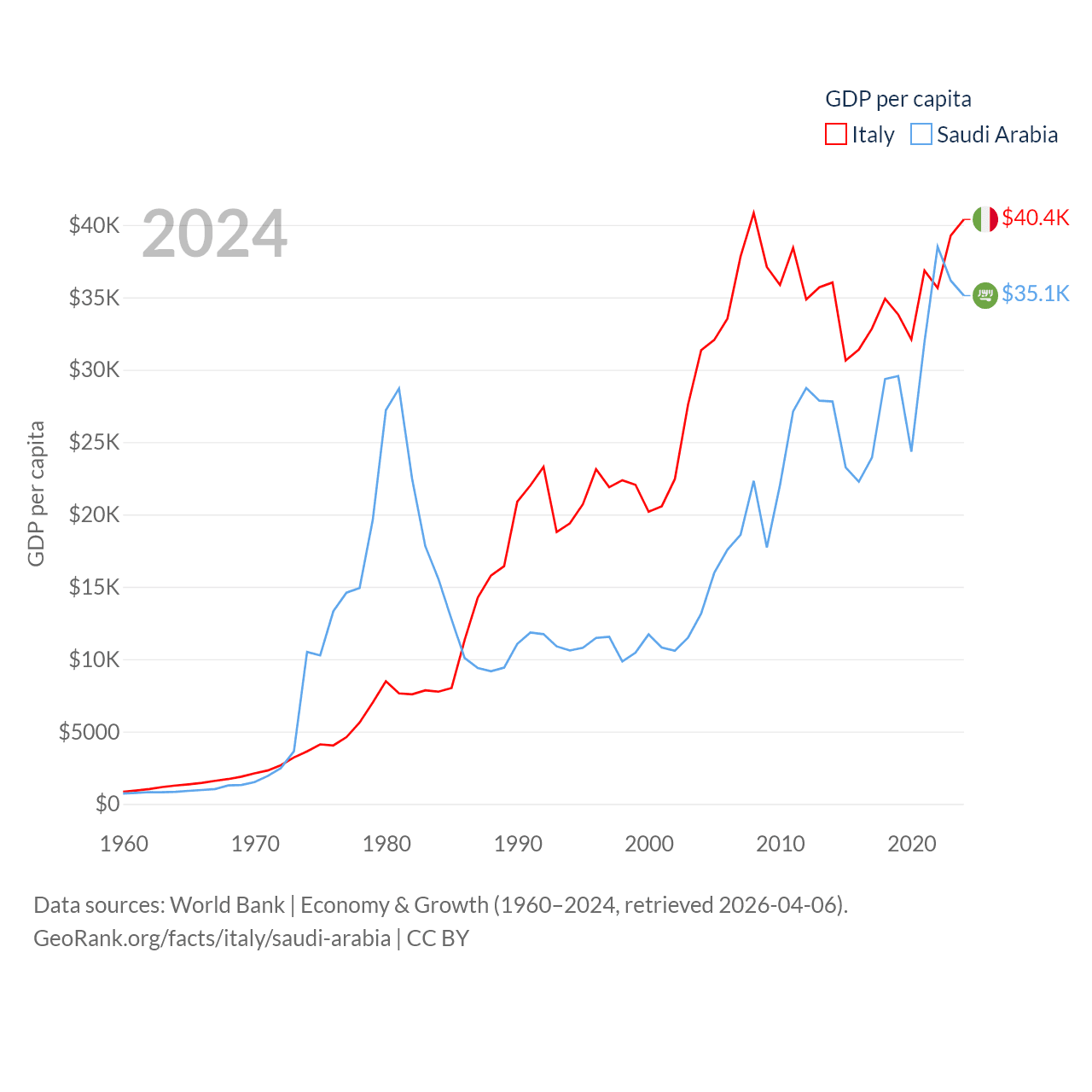 By GDP, Italy ranks 8/197 ($2.38T) and Saudi Arabia ranks 18/197 ($1.24T). By GDP per capita, Italy ranks 29/197 ($40,385), while Saudi Arabia ranks 33/197 ($35,122).