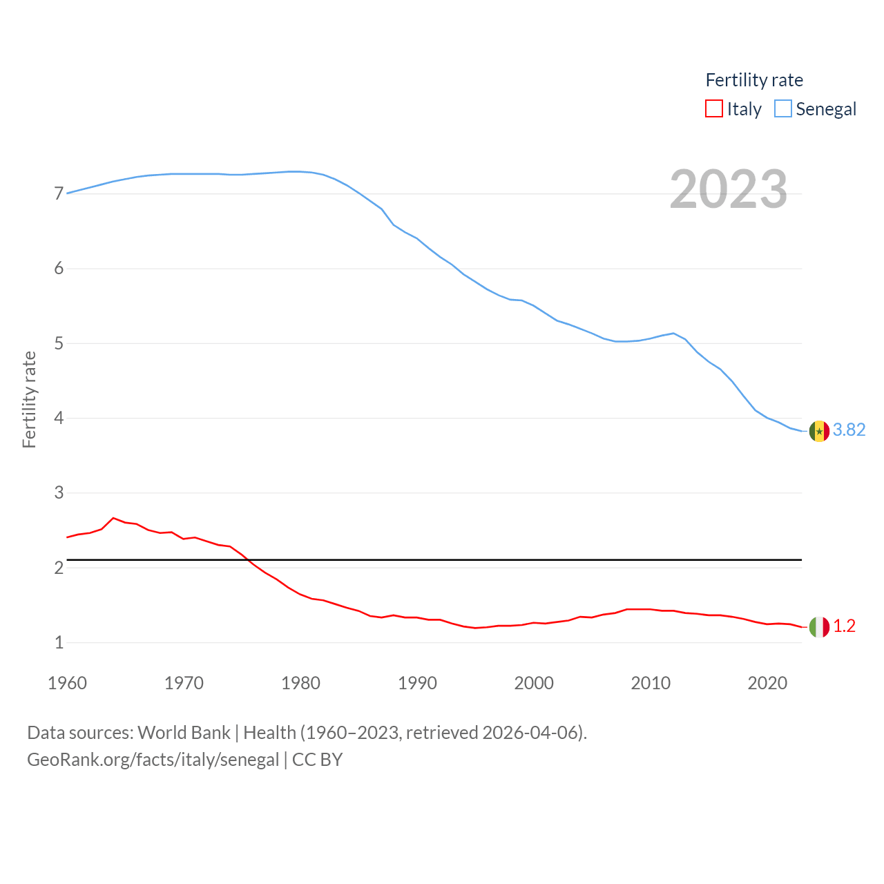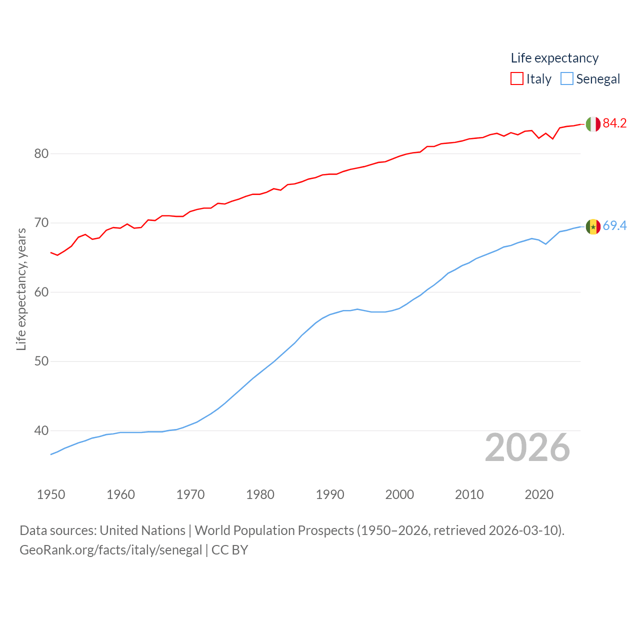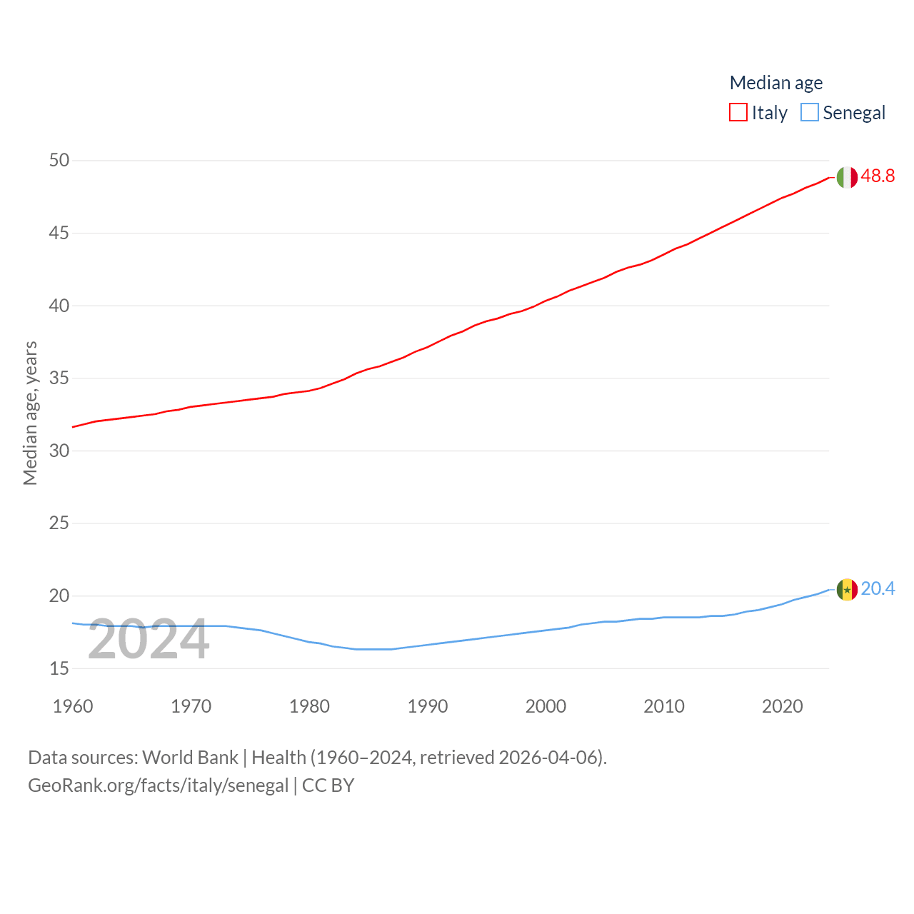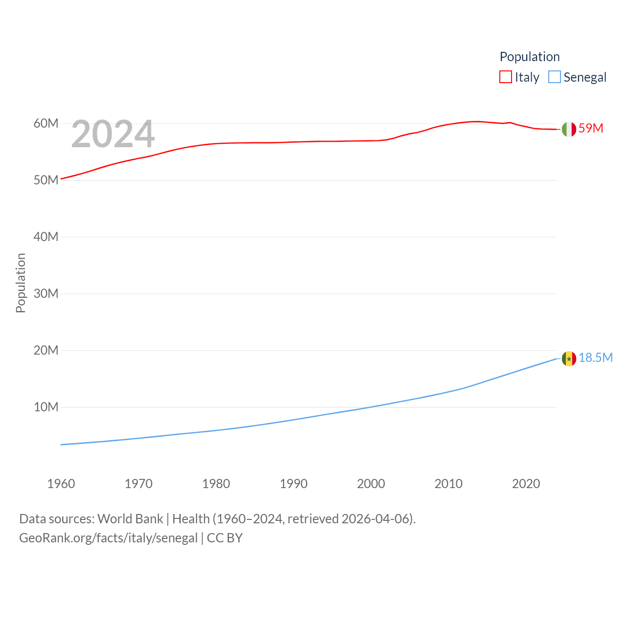 Italy has a population of 59M (ranked 25/197), compared with 18.5M in Senegal (ranked 69/197). Italy's land area is 114,178 sq mi versus 74,336 sq mi for Senegal (ranked 72nd vs. 85th).