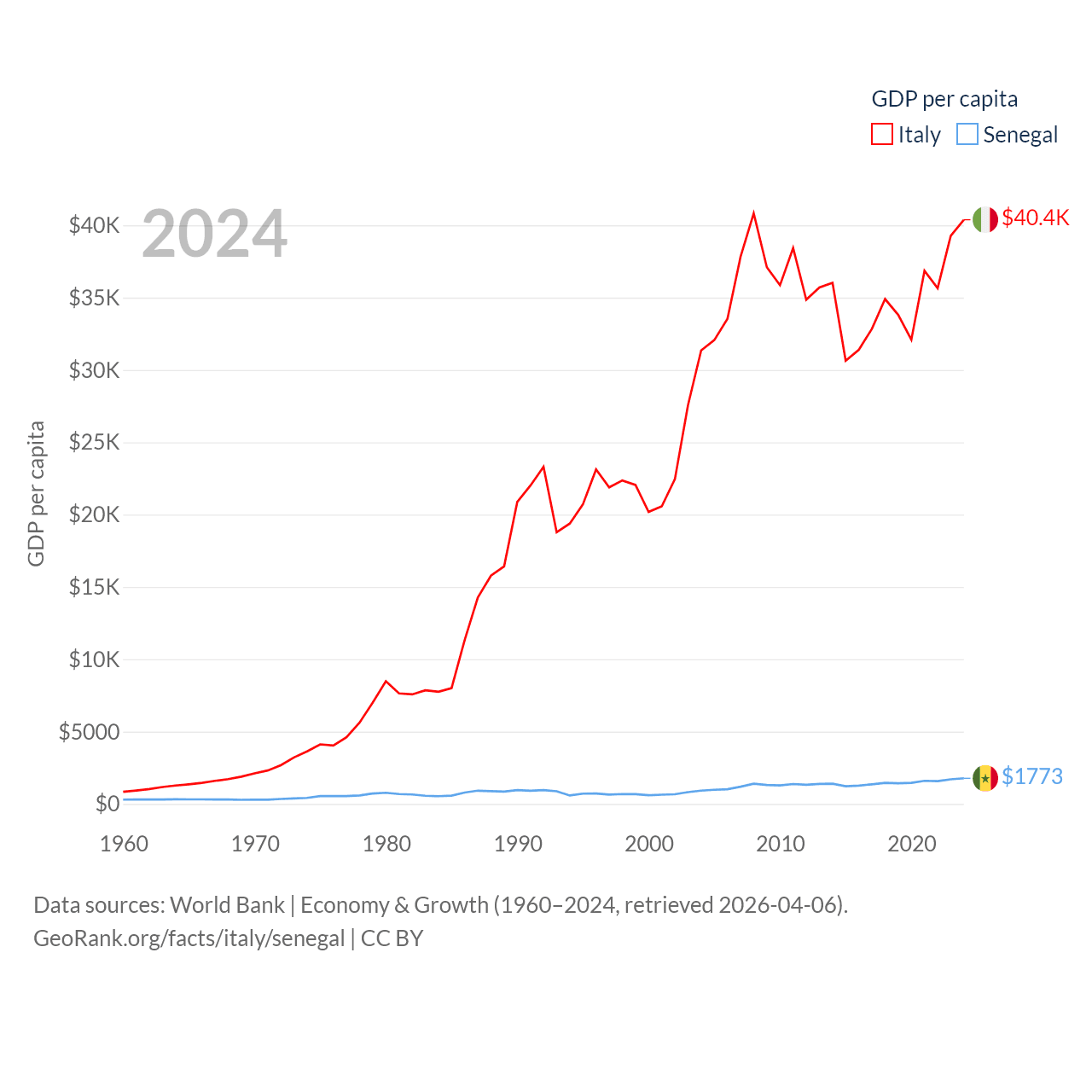 By GDP, Italy ranks 8/197 ($2.38T) and Senegal ranks 109/197 ($32.8B). By GDP per capita, Italy ranks 29/197 ($40,385), while Senegal ranks 159/197 ($1,773).