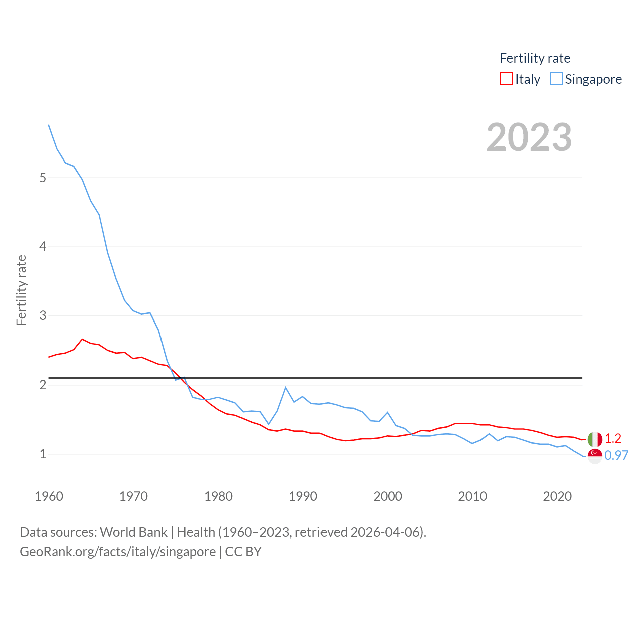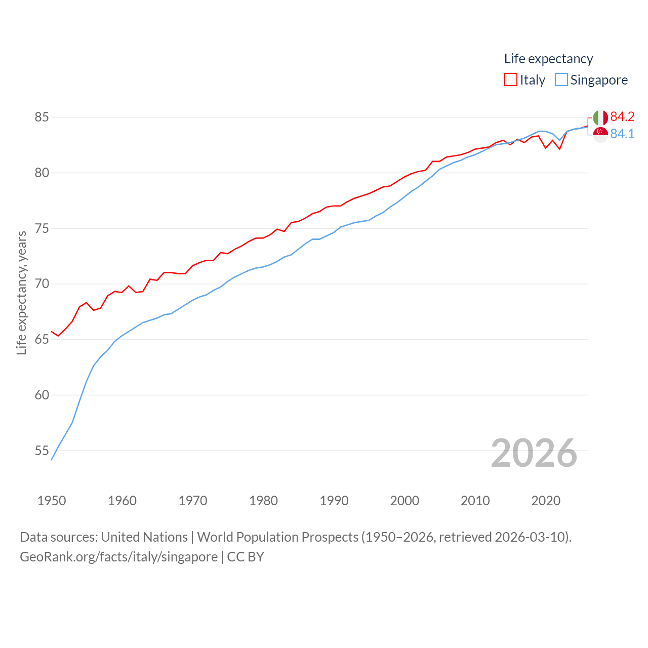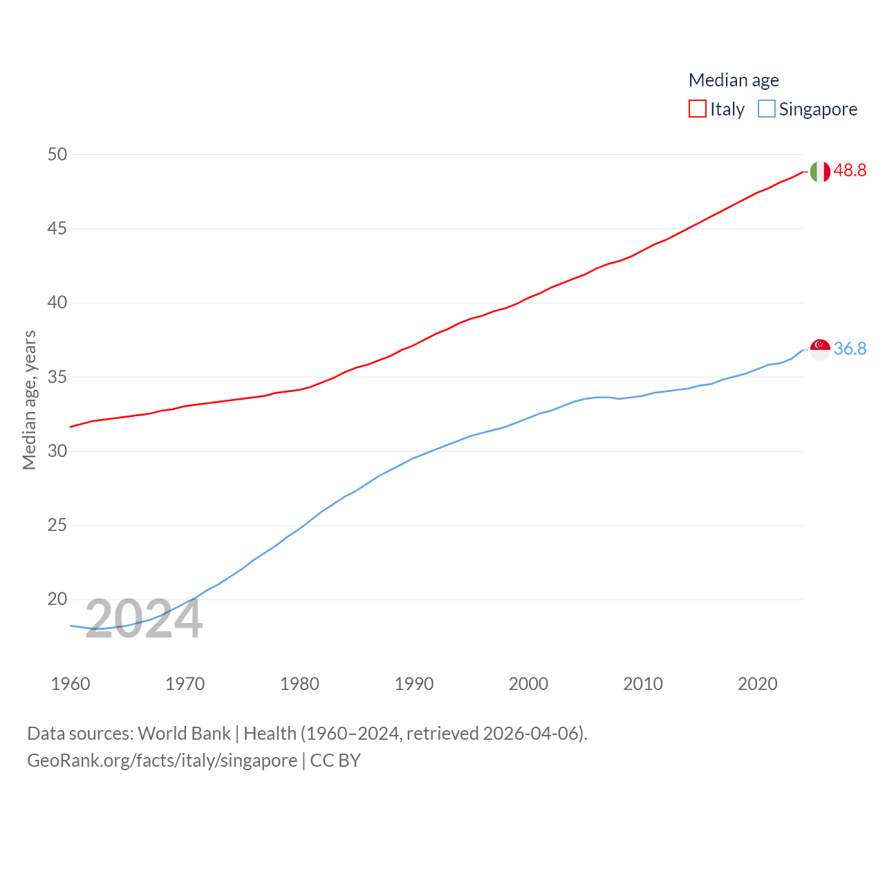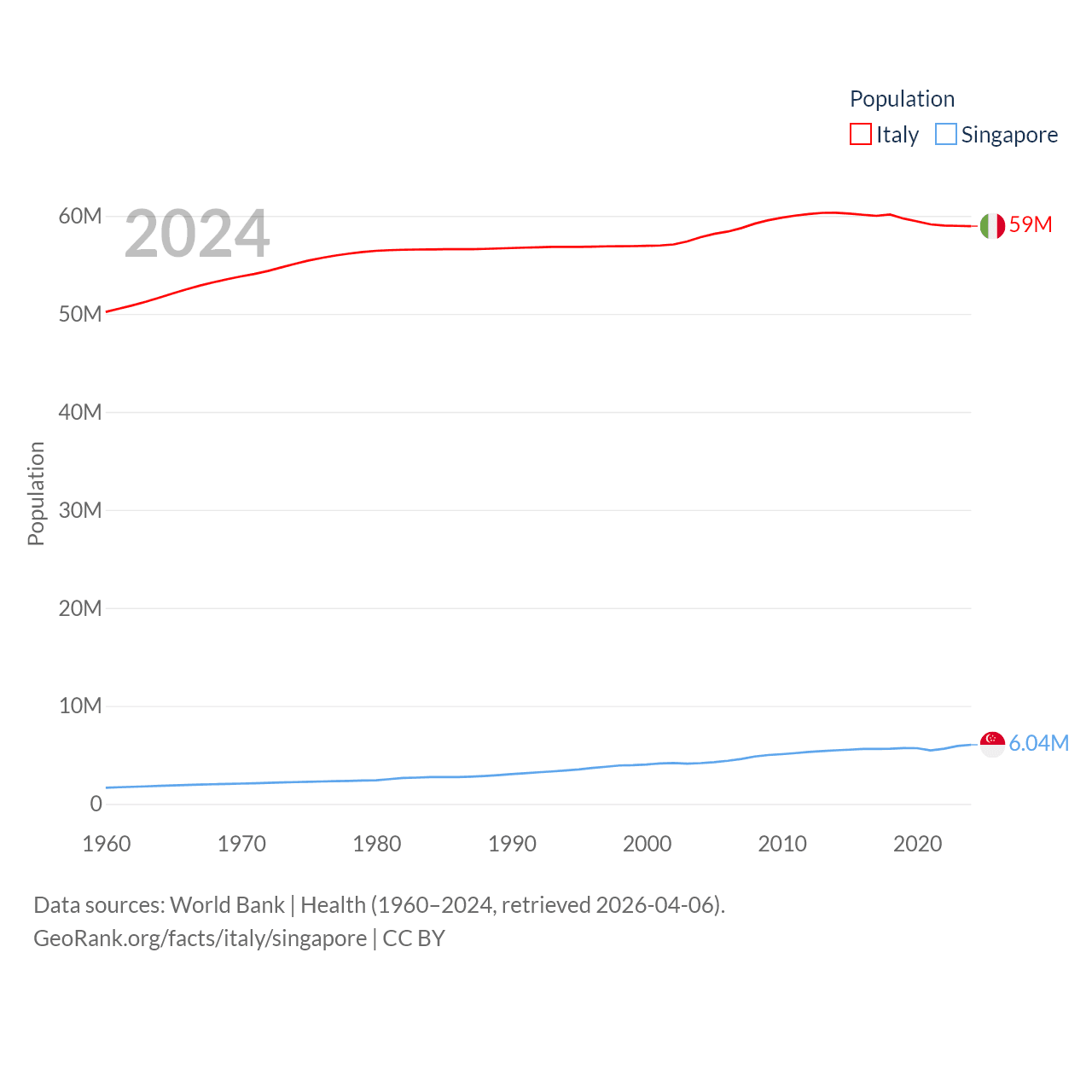 Italy has a population of 59M (ranked 25/197), compared with 6.04M in Singapore (ranked 113/197). Italy's land area is 114,178 sq mi versus 277.2 sq mi for Singapore (ranked 72nd vs. 177th).