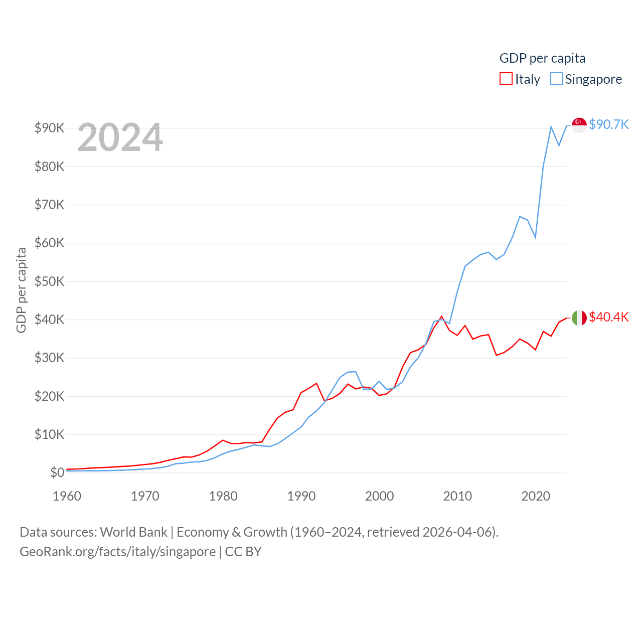 By GDP, Italy ranks 8/197 ($2.38T) and Singapore ranks 28/197 ($547B). By GDP per capita, Italy ranks 29/197 ($40,385), while Singapore ranks 7/197 ($90,674).