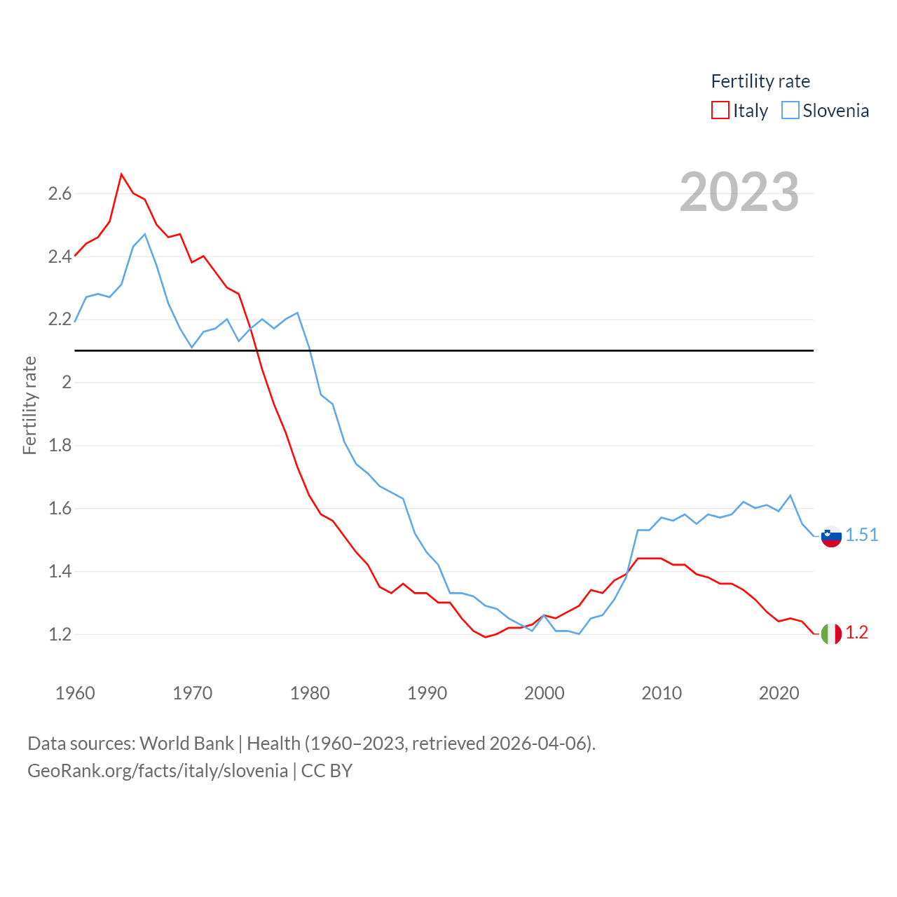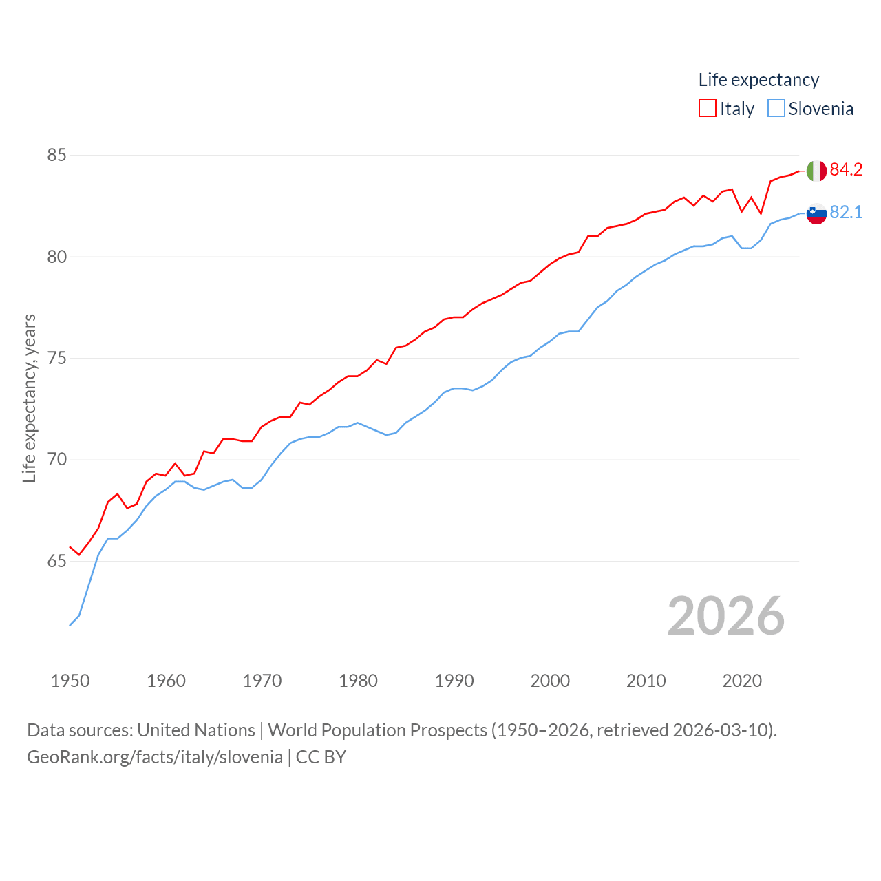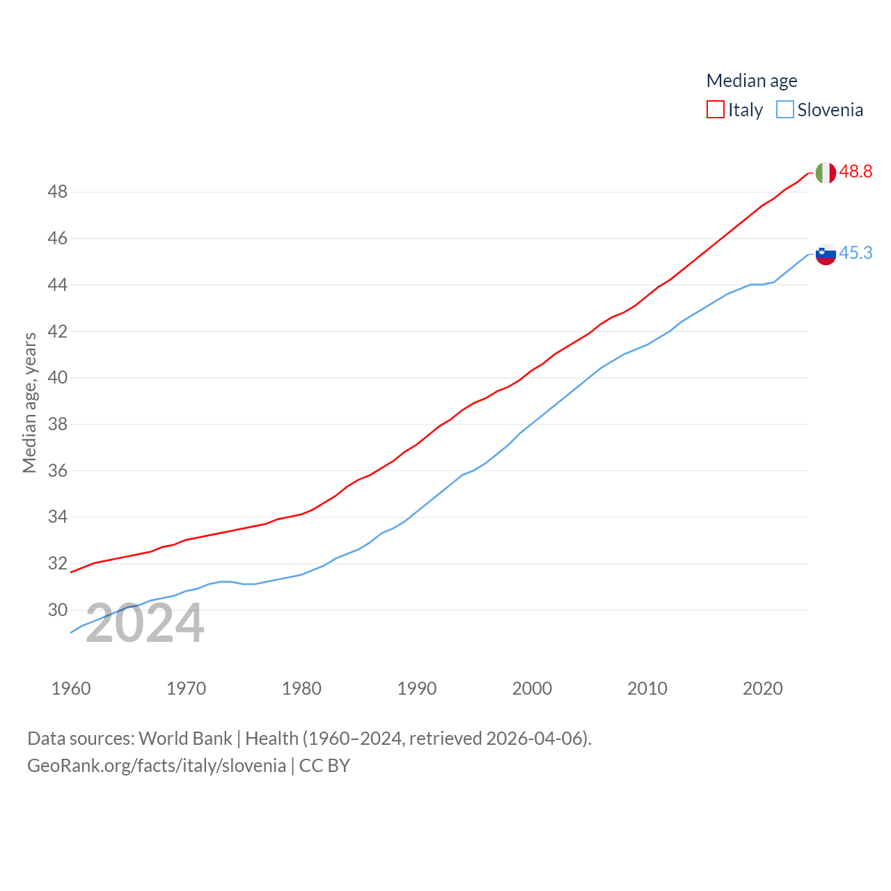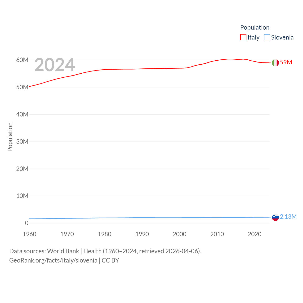Italy has a population of 59M (ranked 25/197), compared with 2.13M in Slovenia (ranked 147/197). Italy's land area is 114,178 sq mi versus 7,774 sq mi for Slovenia (ranked 72nd vs. 151st).