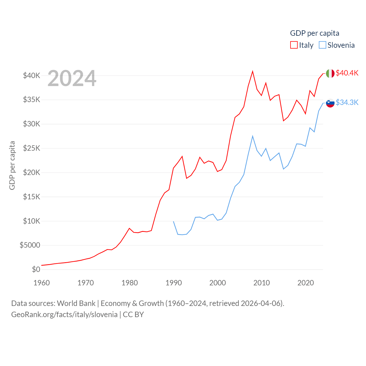 By GDP, Italy ranks 8/197 ($2.38T) and Slovenia ranks 86/197 ($73B). By GDP per capita, Italy ranks 29/197 ($40,385), while Slovenia ranks 34/197 ($34,301).