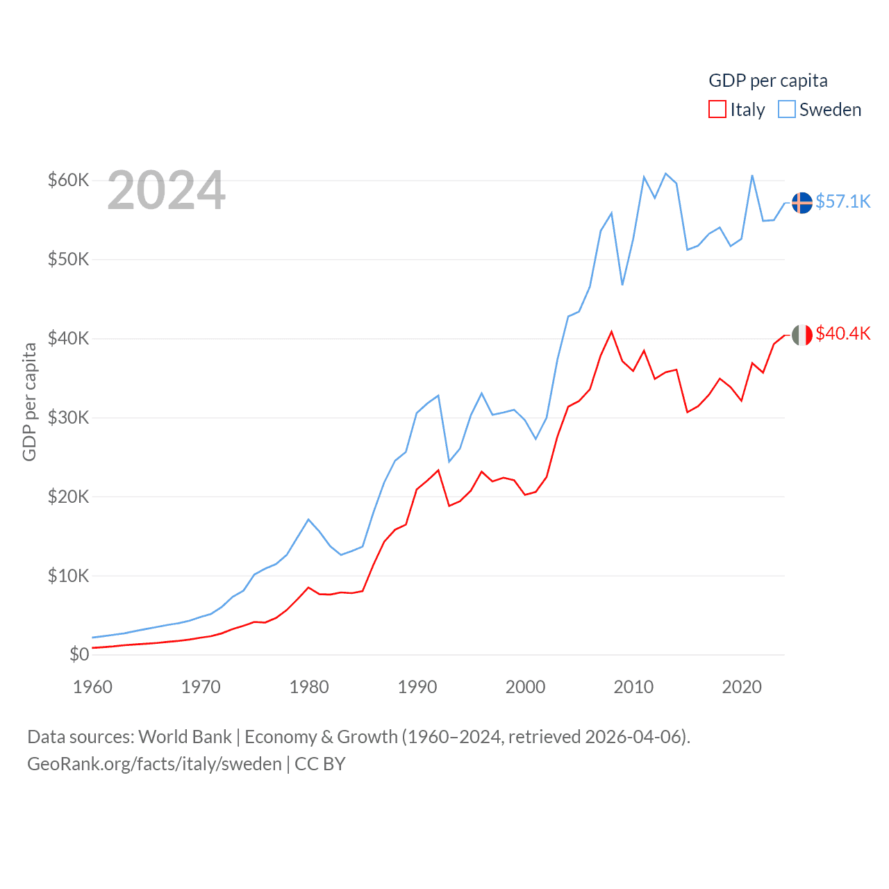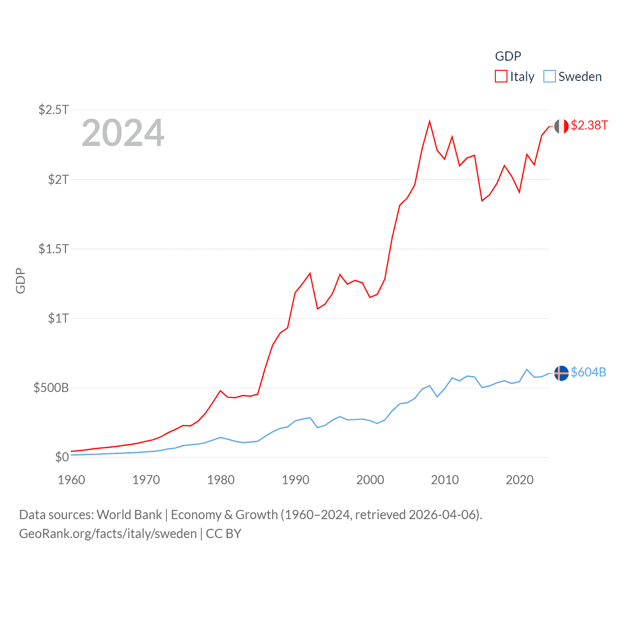 By GDP, Italy ranks 8/197 ($2.38T) and Sweden ranks 26/197 ($604B). By GDP per capita, Italy ranks 29/197 ($40,385), while Sweden ranks 17/197 ($57,117).
