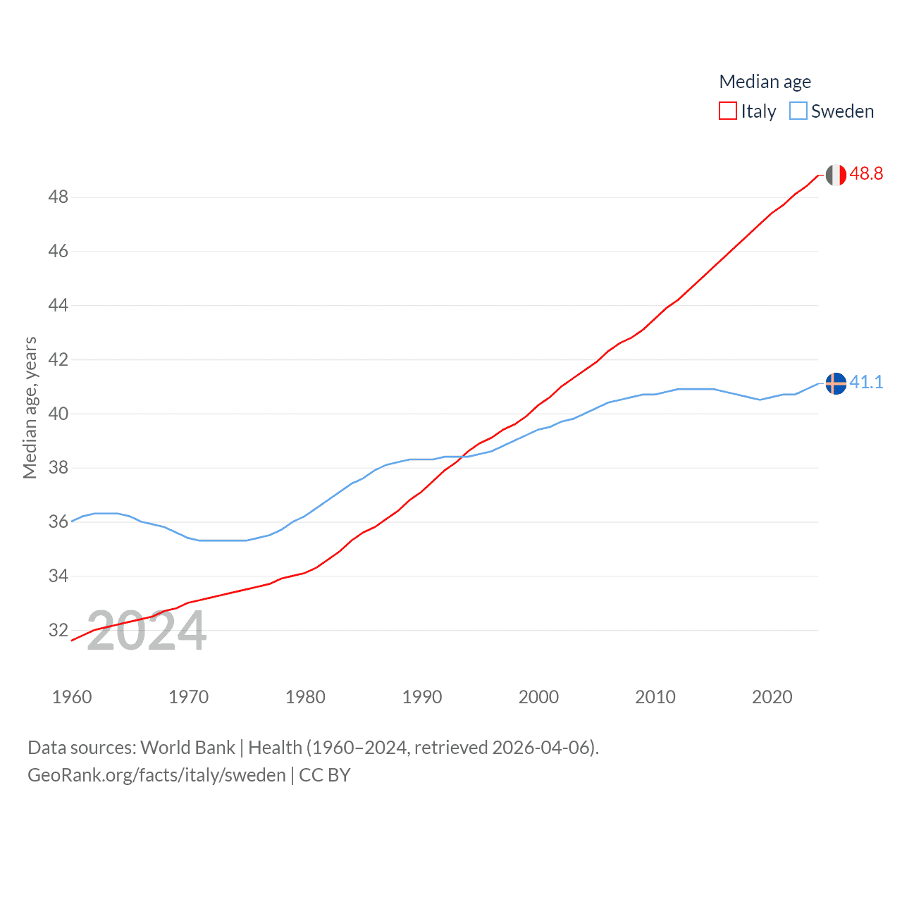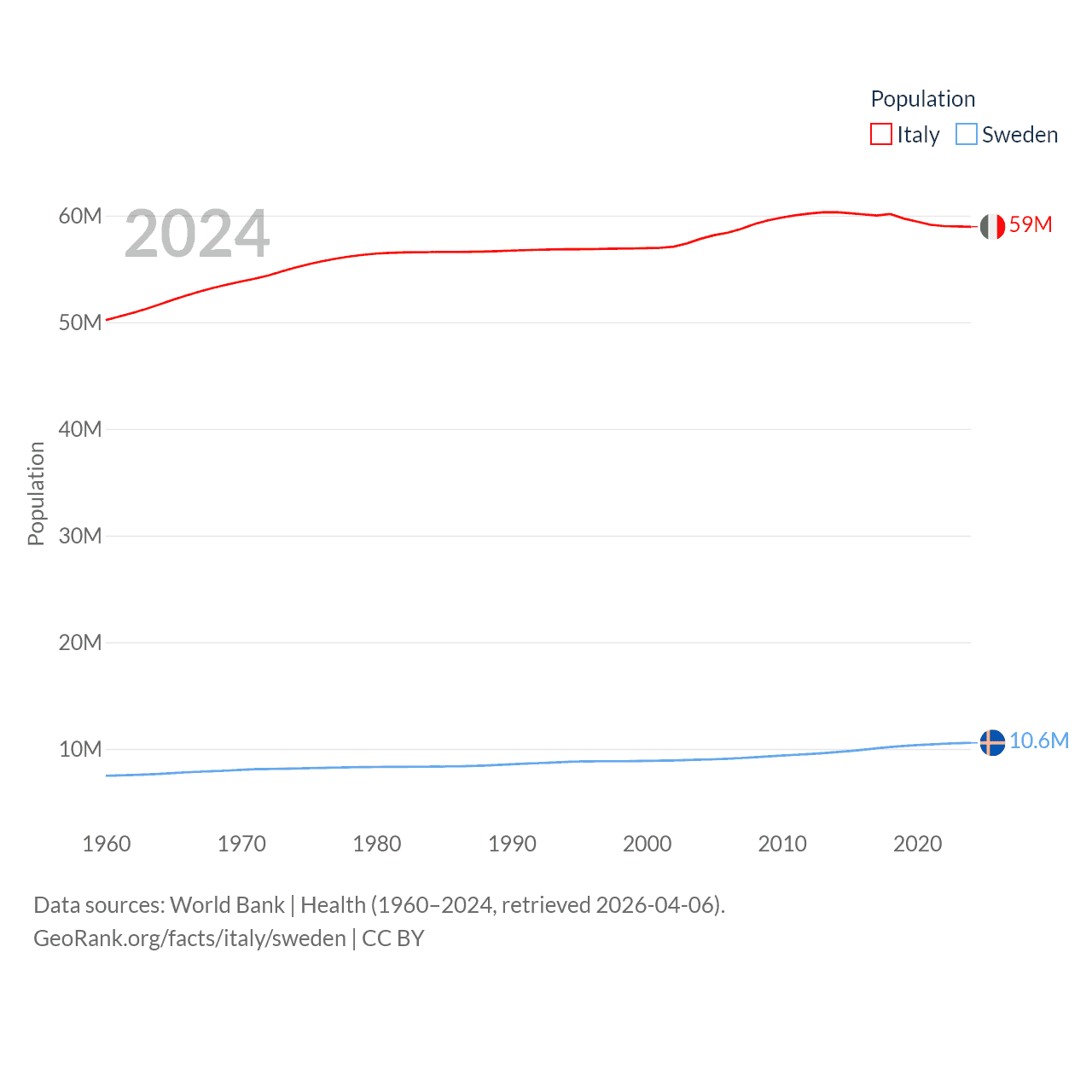 Italy has a population of 59M (ranked 25/197), compared with 10.6M in Sweden (ranked 93/197). Italy's land area is 114,178 sq mi versus 157,248 sq mi for Sweden (ranked 72nd vs. 58th).