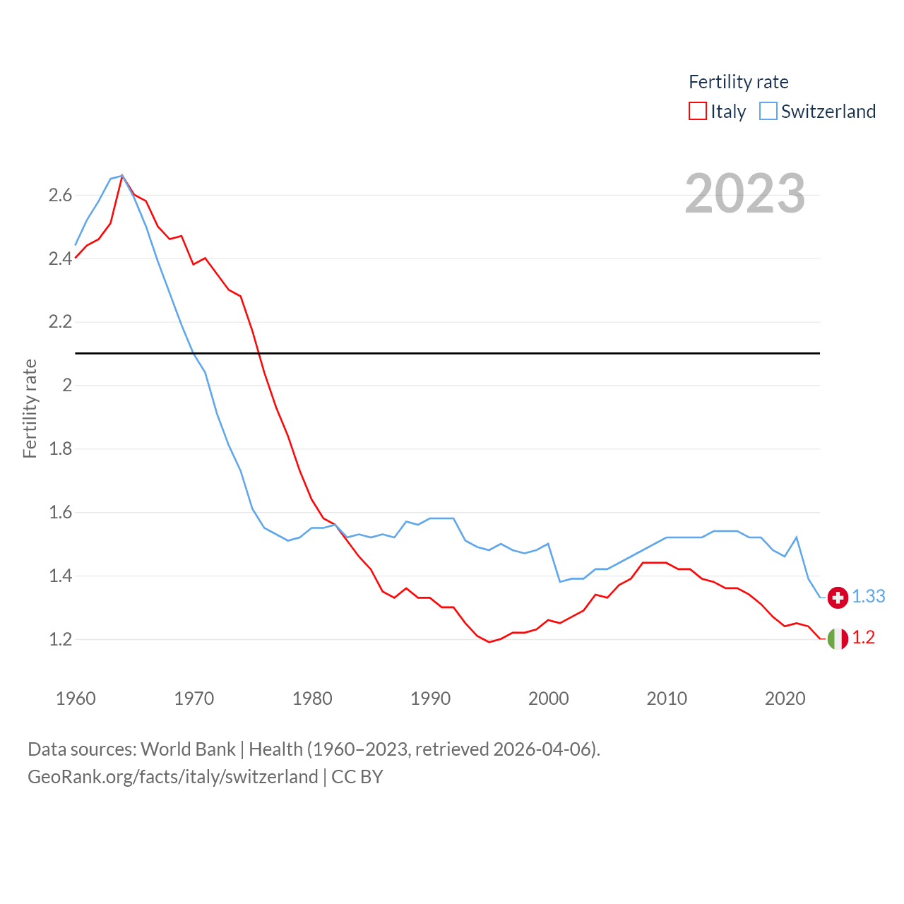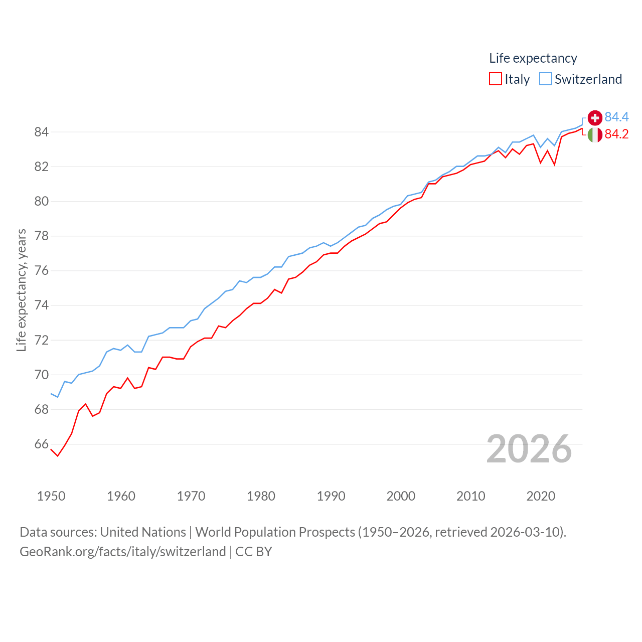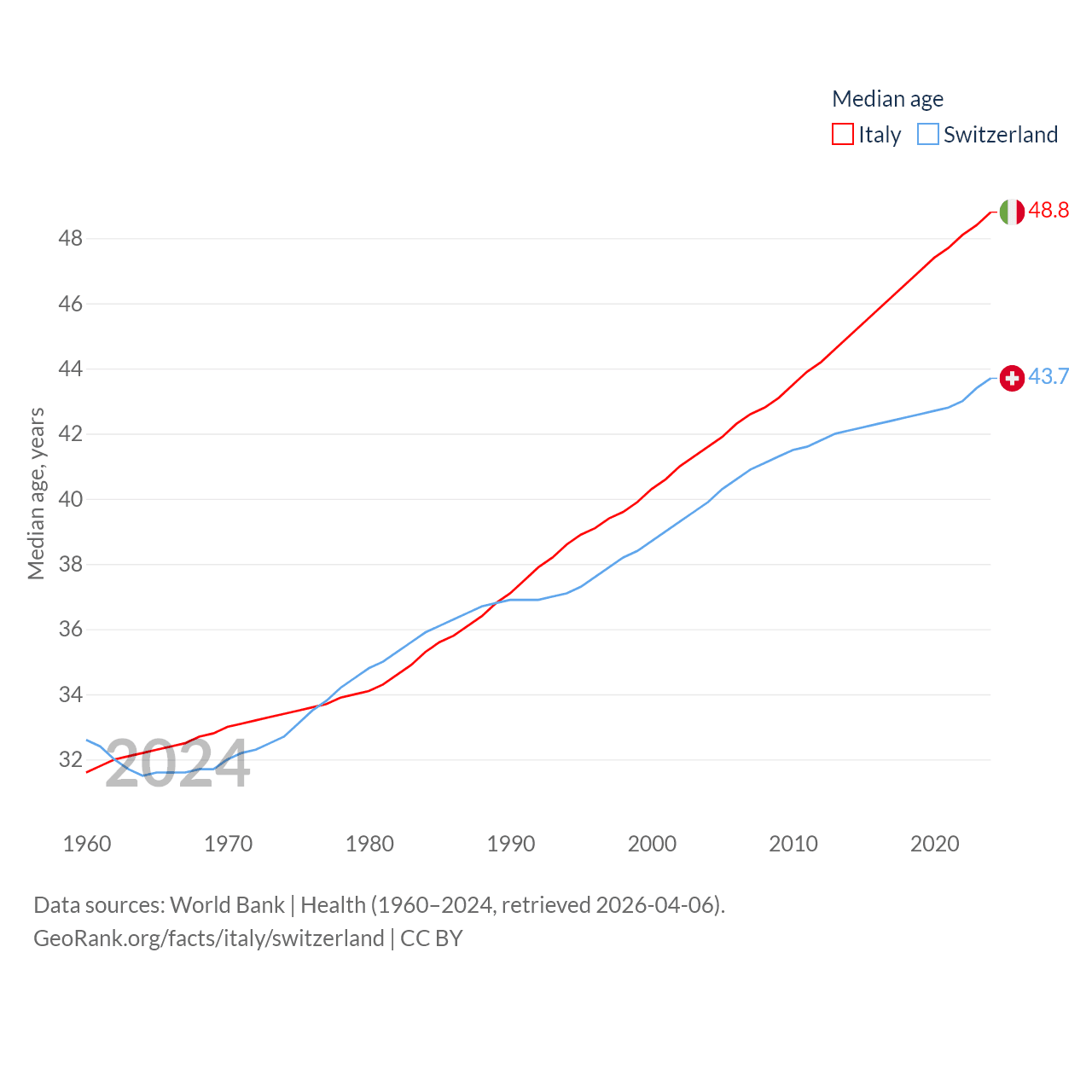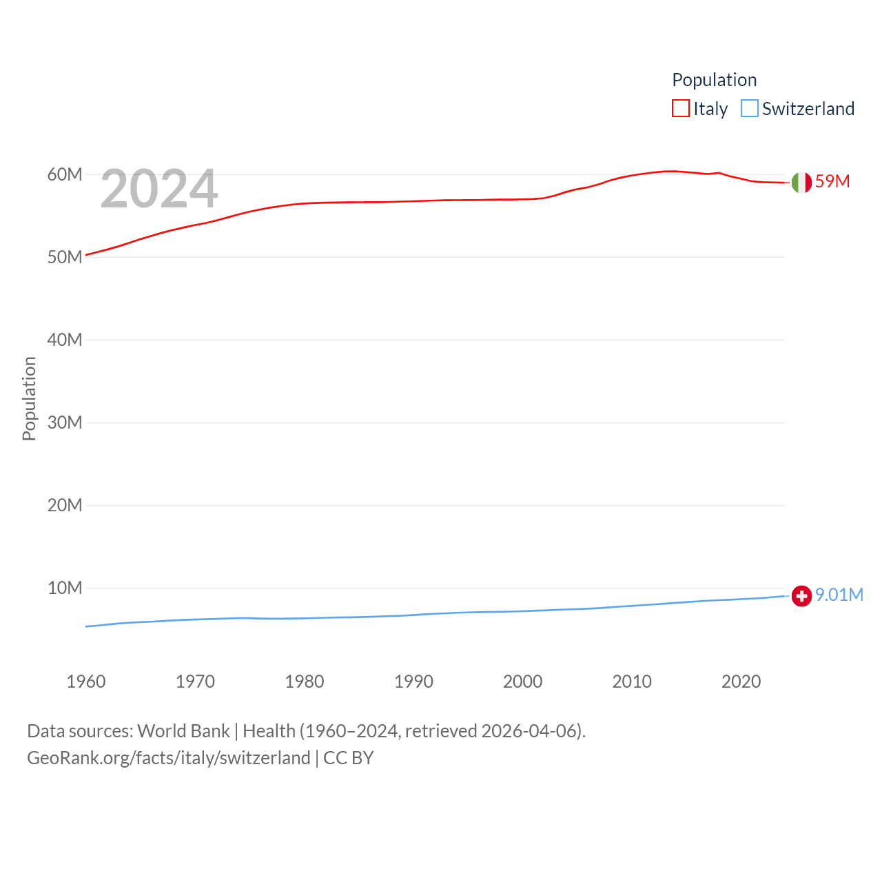 Italy has a population of 59M (ranked 25/197), compared with 9.01M in Switzerland (ranked 101/197). Italy's land area is 114,178 sq mi versus 15,255 sq mi for Switzerland (ranked 72nd vs. 131st).
