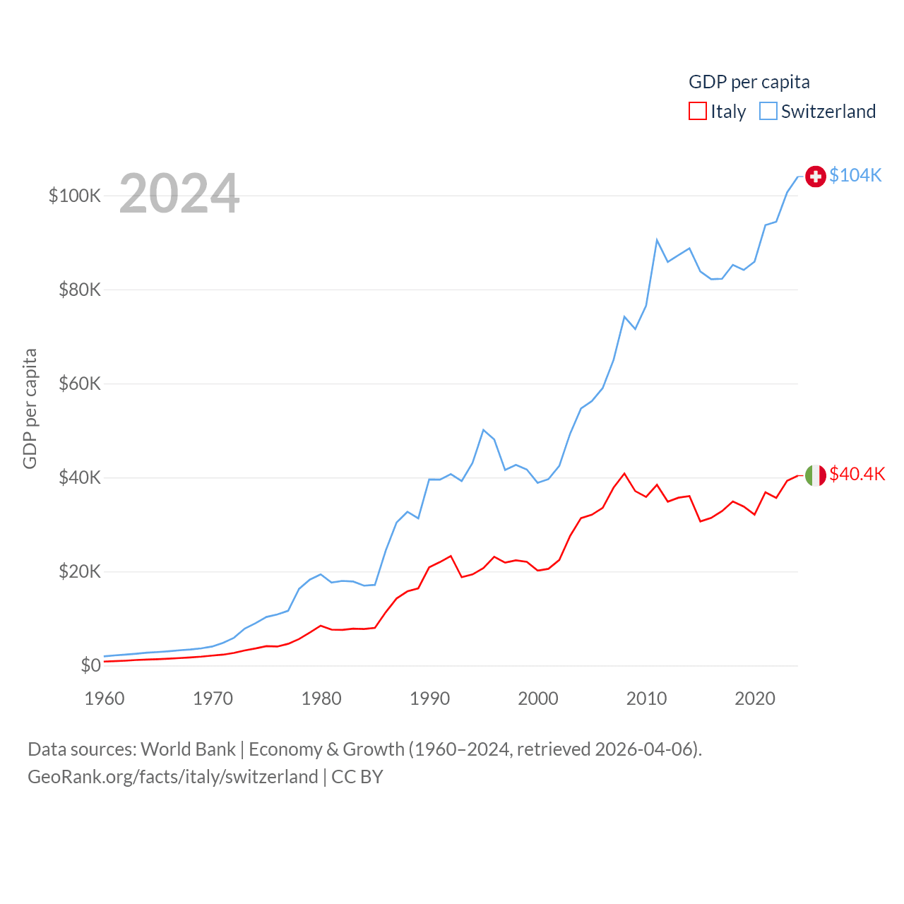 By GDP, Italy ranks 8/197 ($2.38T) and Switzerland ranks 20/197 ($937B). By GDP per capita, Italy ranks 29/197 ($40,385), while Switzerland ranks 5/197 ($103,998).