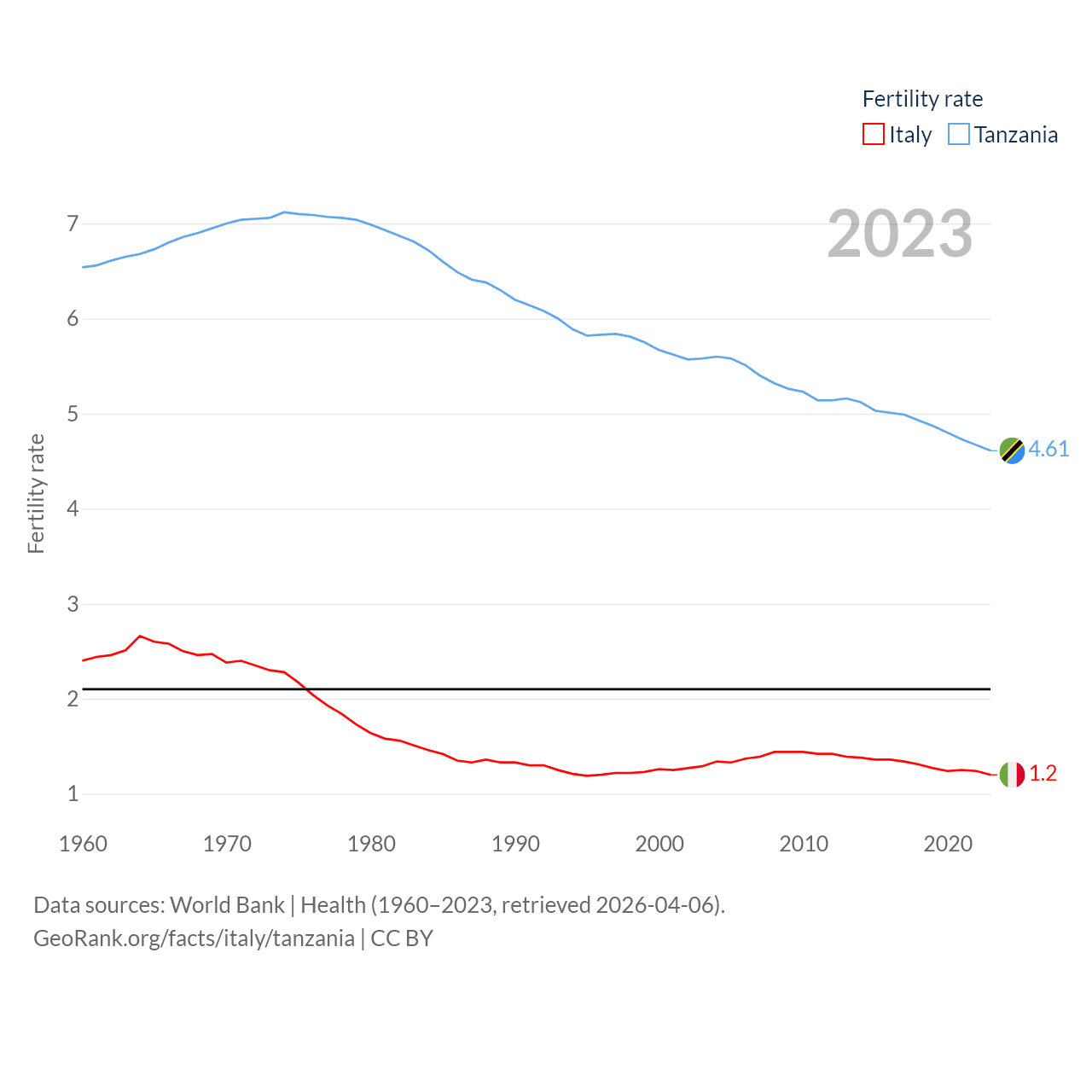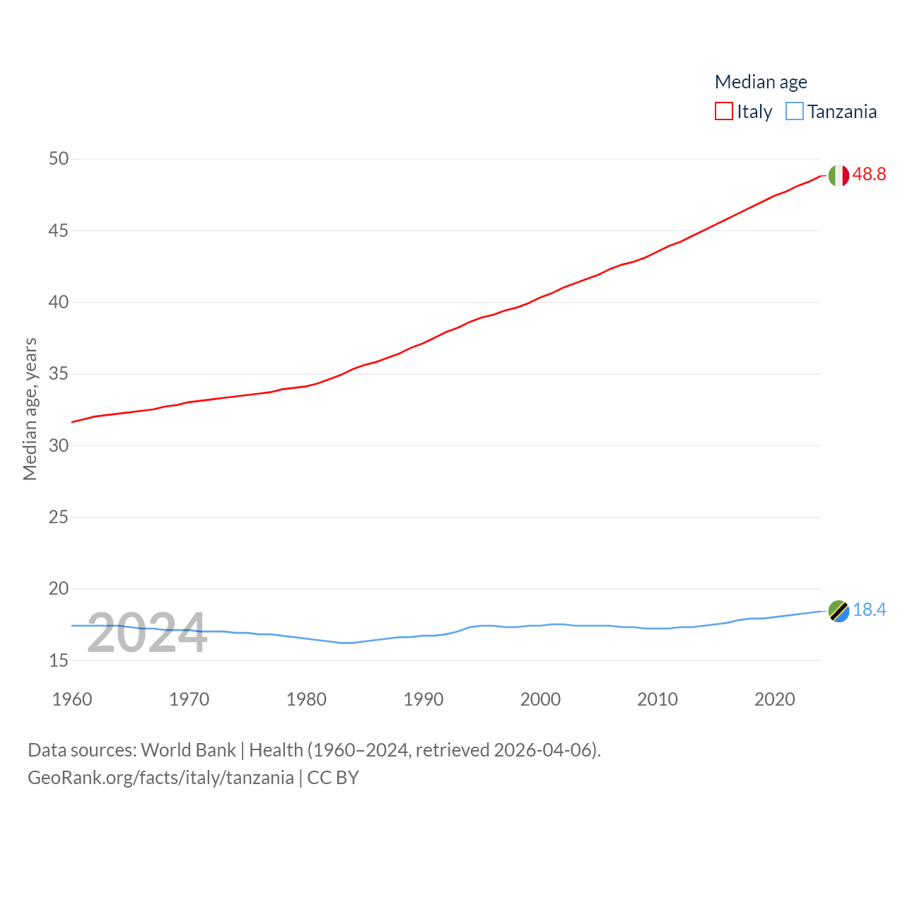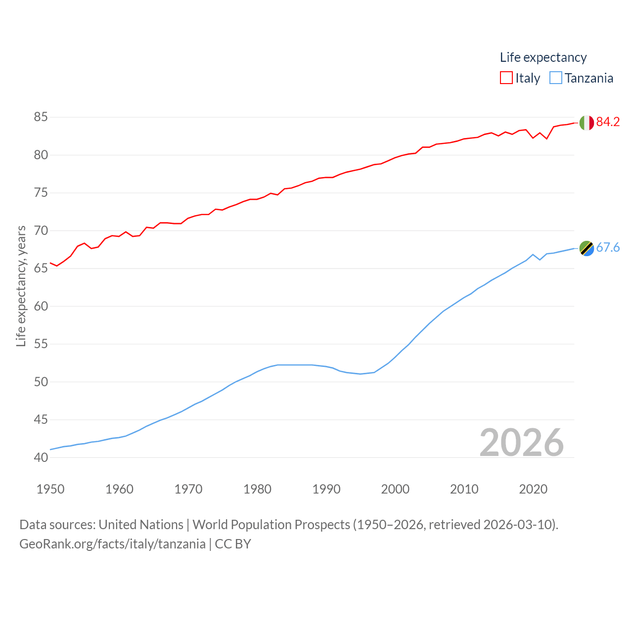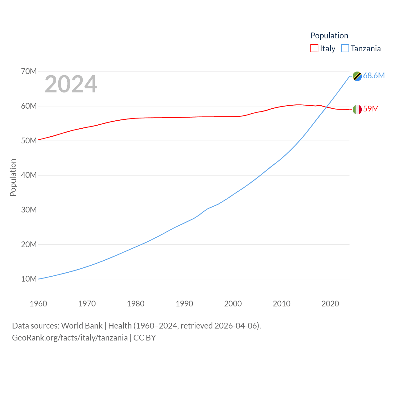 Italy has a population of 59M (ranked 25/197), compared with 68.6M in Tanzania (ranked 22/197). Italy's land area is 114,178 sq mi versus 342,009 sq mi for Tanzania (ranked 72nd vs. 31st).