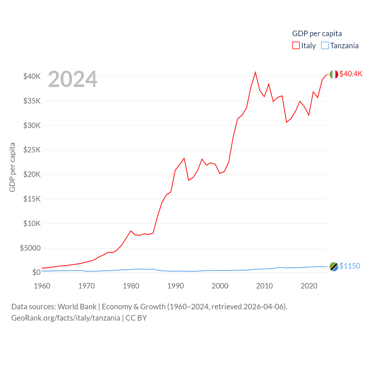 By GDP, Italy ranks 8/197 ($2.38T) and Tanzania ranks 82/197 ($78.8B). By GDP per capita, Italy ranks 29/197 ($40,385), while Tanzania ranks 170/197 ($1,150).