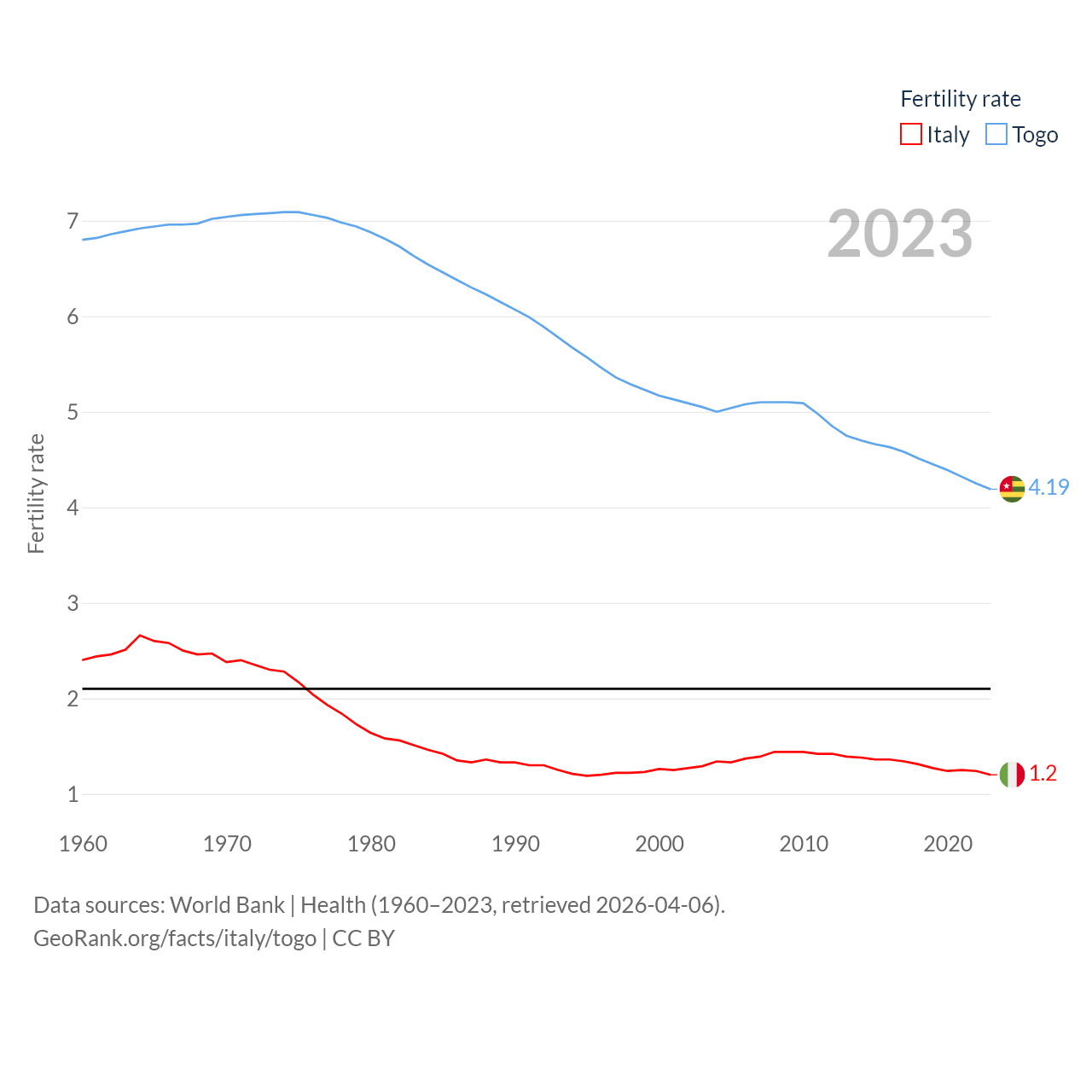 Italy has a population of 59M (ranked 25/197), compared with 9.52M in Togo (ranked 98/197). Italy's land area is 114,178 sq mi versus 21,000 sq mi for Togo (ranked 72nd vs. 124th).
