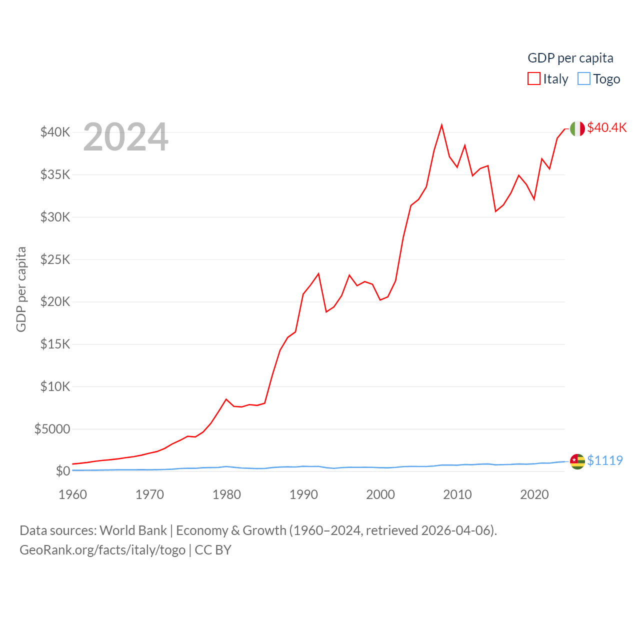 By GDP, Italy ranks 8/197 ($2.38T) and Togo ranks 154/197 ($10.7B). By GDP per capita, Italy ranks 29/197 ($40,385), while Togo ranks 172/197 ($1,119).