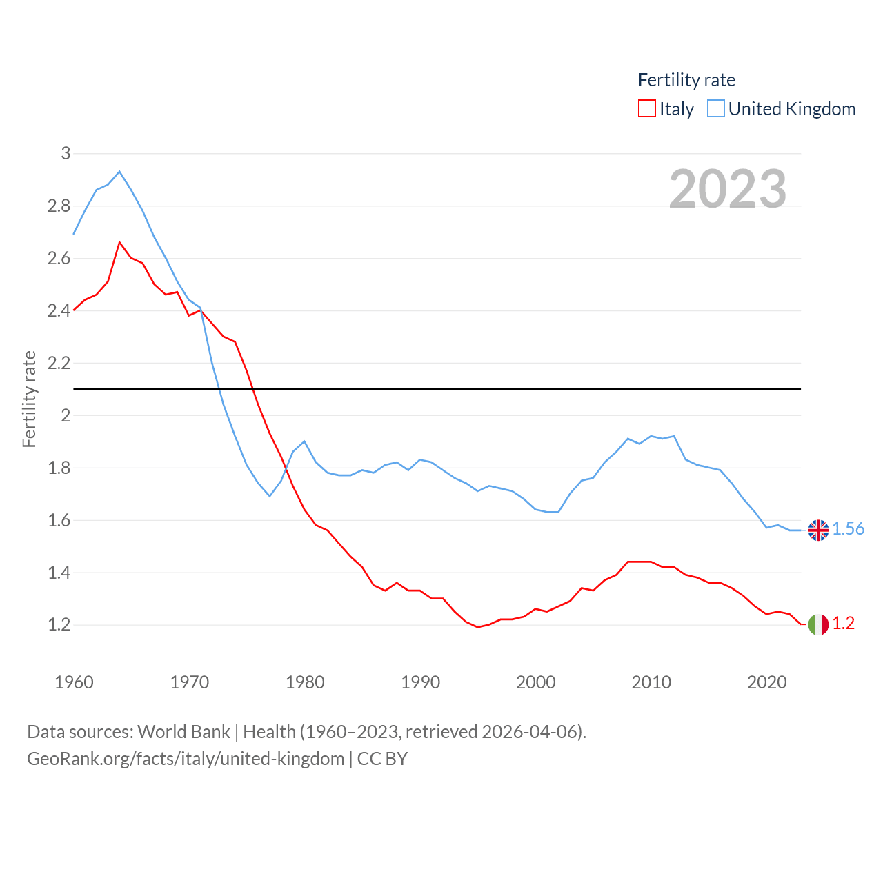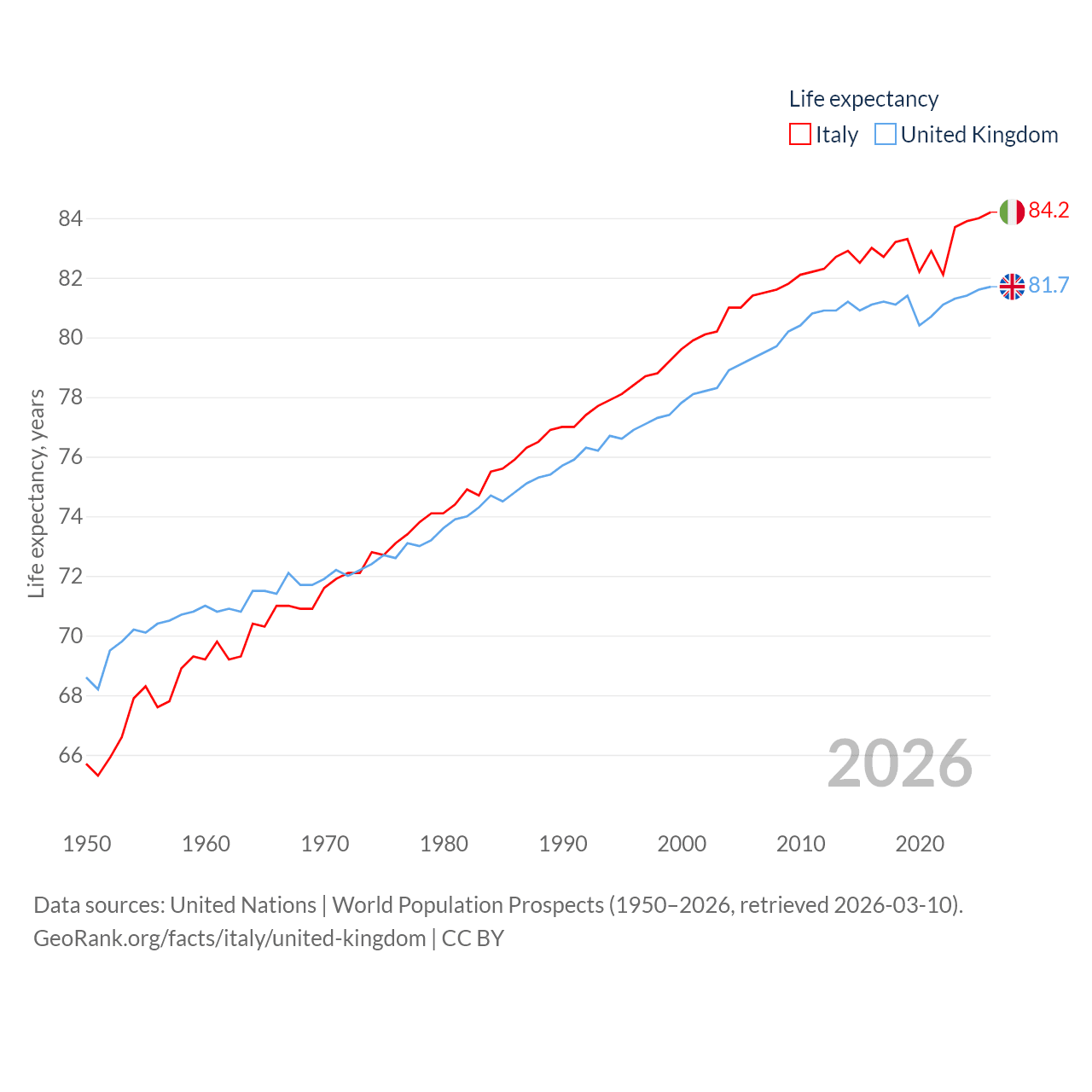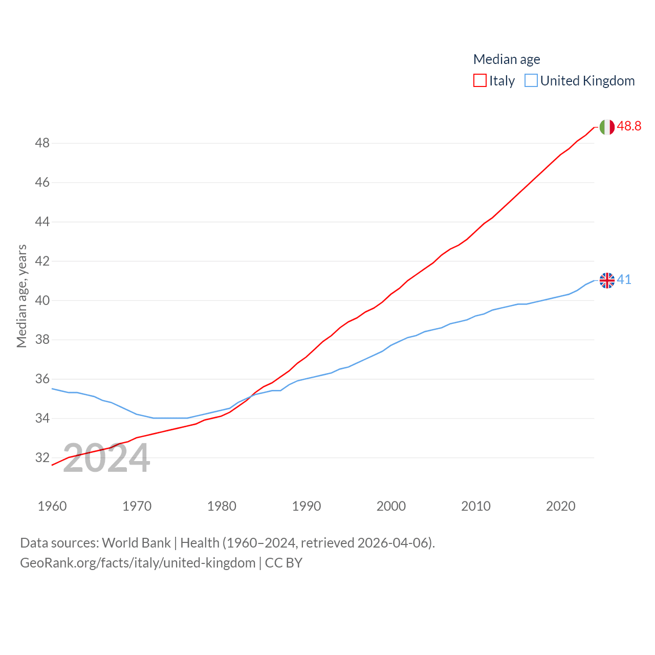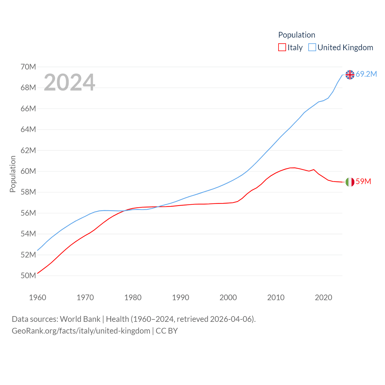 Italy has a population of 59M (ranked 25/197), compared with 69.2M in The United Kingdom (ranked 21/197). Italy's land area is 114,178 sq mi versus 93,410 sq mi for The United Kingdom (ranked 72nd vs. 78th).