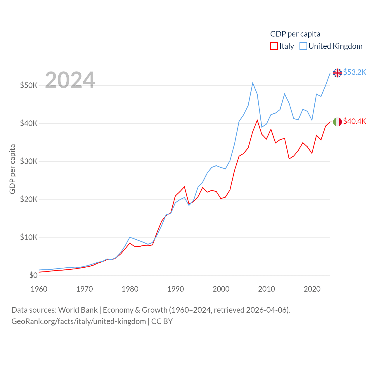 By GDP, Italy ranks 8/197 ($2.38T) and The United Kingdom ranks 6/197 ($3.69T). By GDP per capita, Italy ranks 29/197 ($40,385), while The United Kingdom ranks 22/197 ($53,246).