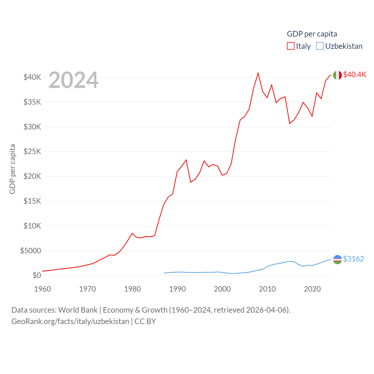 By GDP, Italy ranks 8/197 ($2.38T) and Uzbekistan ranks 66/197 ($115B). By GDP per capita, Italy ranks 29/197 ($40,385), while Uzbekistan ranks 139/197 ($3,162).