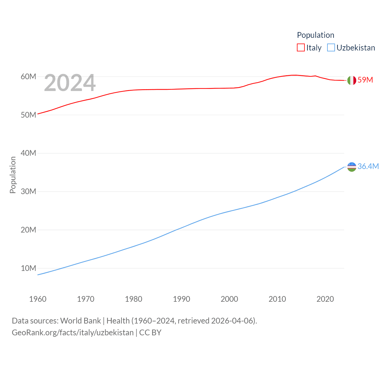 Italy has a population of 59M (ranked 25/197), compared with 36.4M in Uzbekistan (ranked 43/197). Italy's land area is 114,178 sq mi versus 170,136 sq mi for Uzbekistan (ranked 72nd vs. 56th).