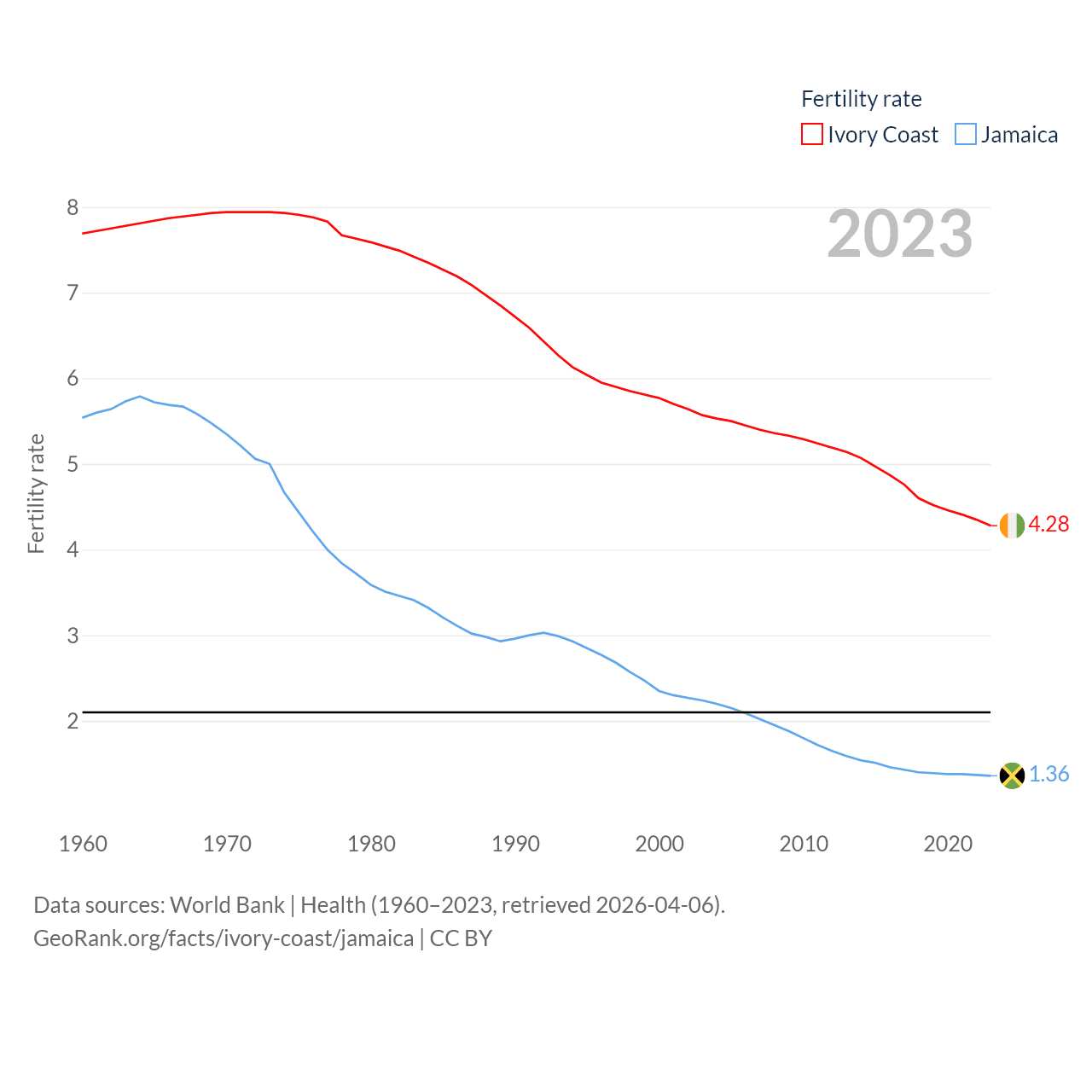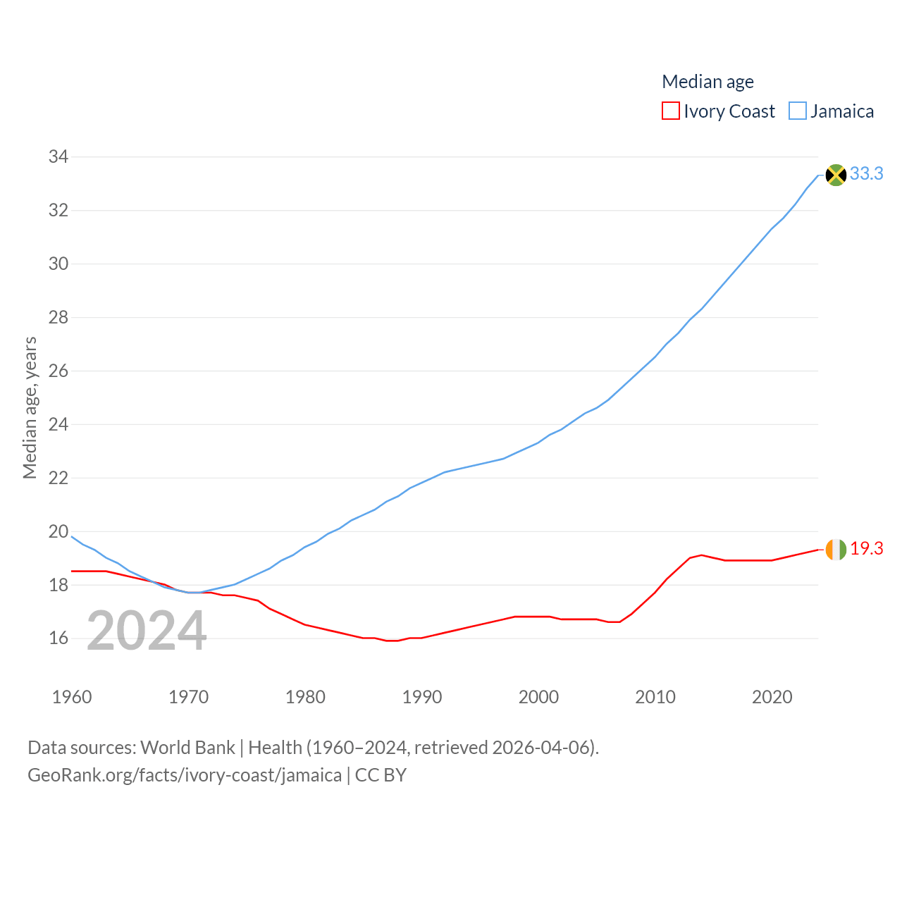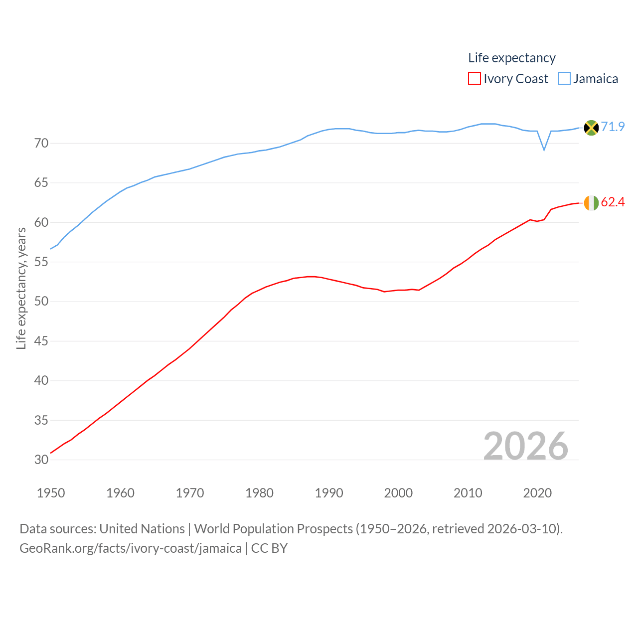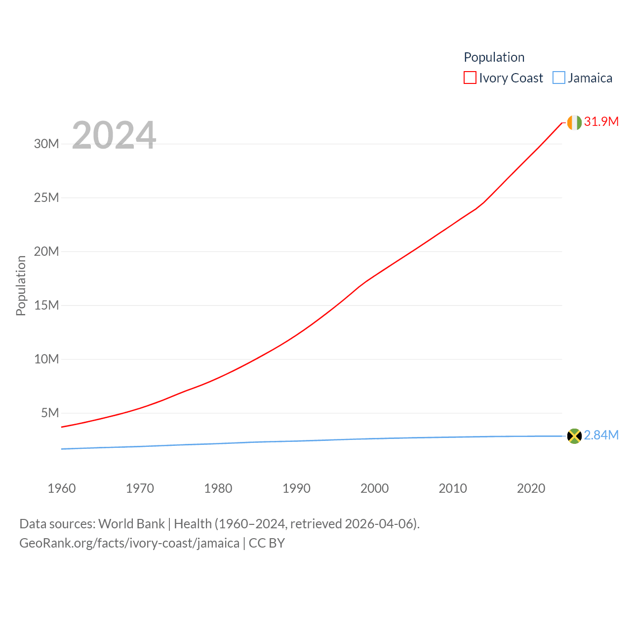 Ivory Coast has a population of 31.9M (ranked 50/197), compared with 2.84M in Jamaica (ranked 139/197). Ivory Coast's land area is 122,780 sq mi versus 4,181 sq mi for Jamaica (ranked 66th vs. 159th).