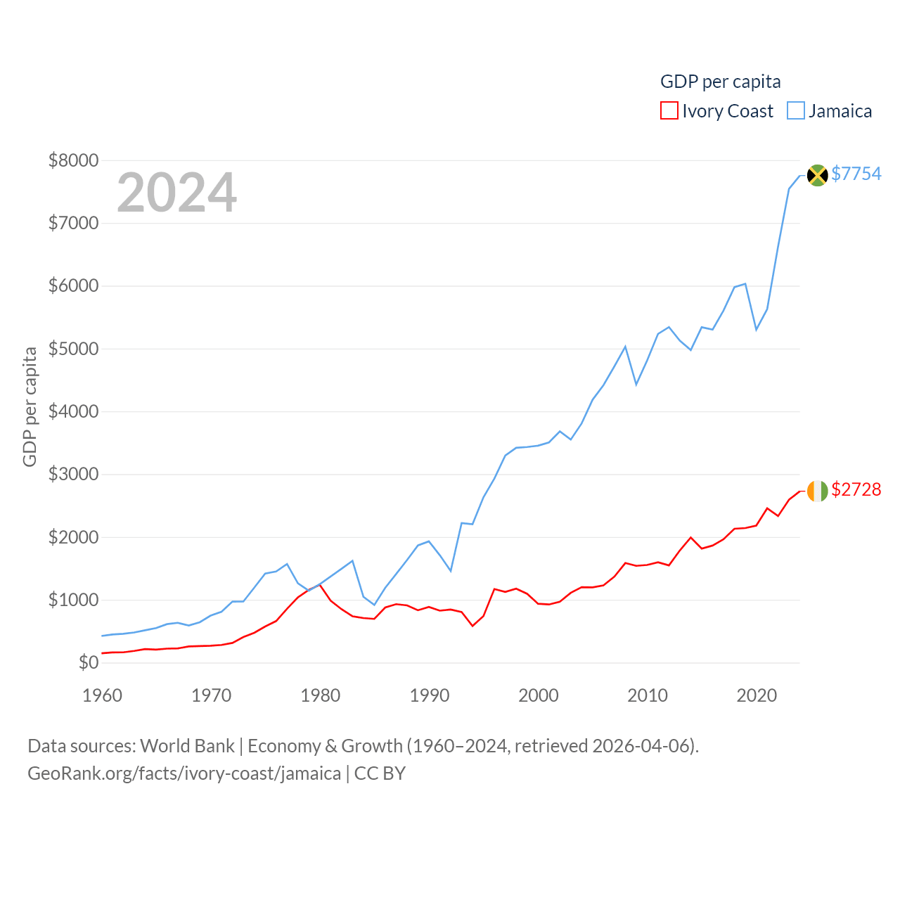 By GDP, Ivory Coast ranks 77/197 ($87.1B) and Jamaica ranks 124/197 ($22B). By GDP per capita, Ivory Coast ranks 142/197 ($2,728), while Jamaica ranks 95/197 ($7,754).