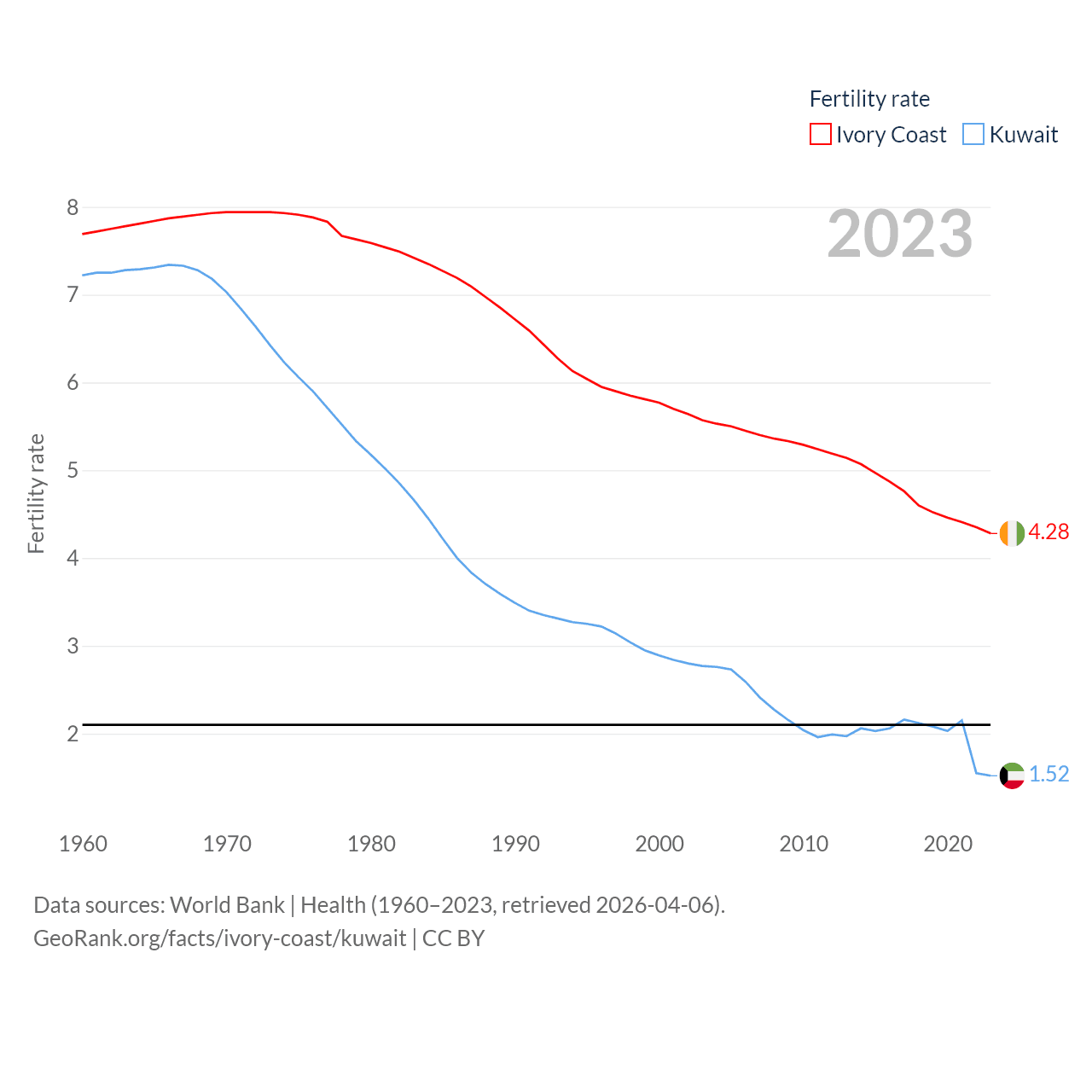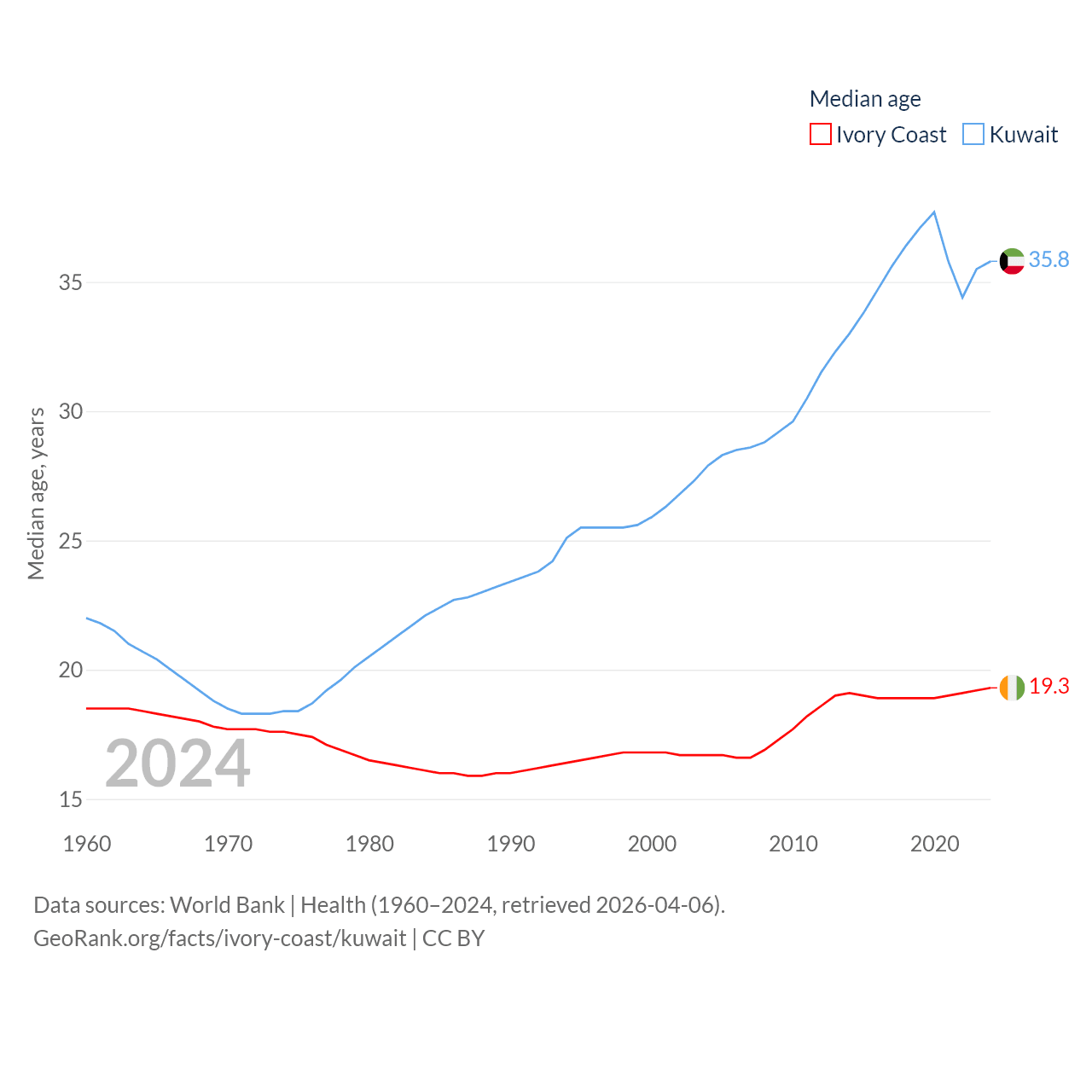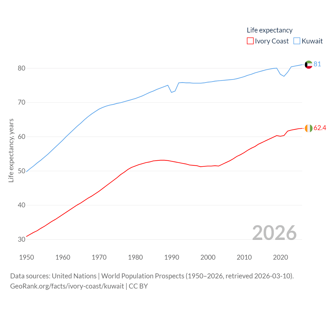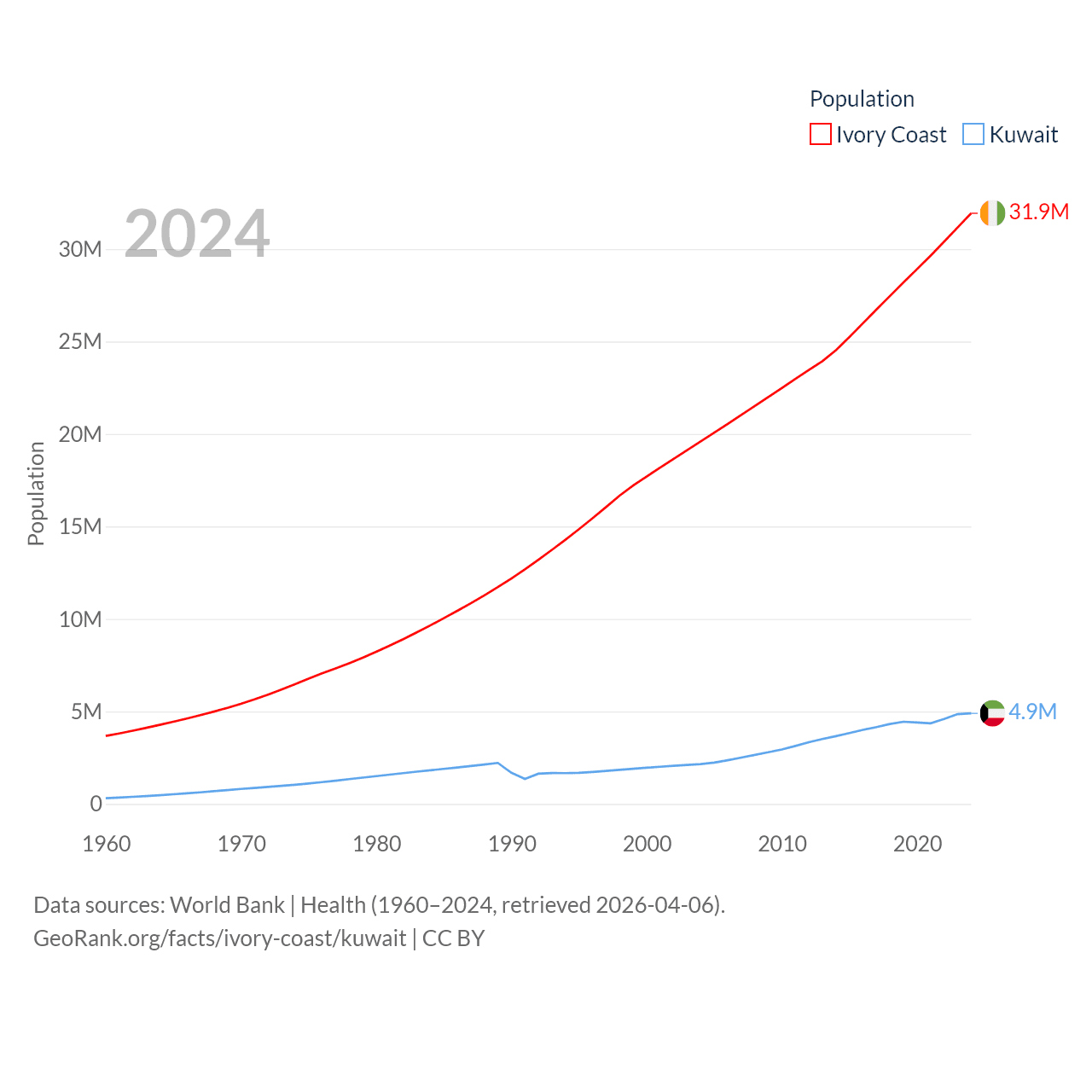 Ivory Coast has a population of 31.9M (ranked 50/197), compared with 4.9M in Kuwait (ranked 127/197). Ivory Coast's land area is 122,780 sq mi versus 6,880 sq mi for Kuwait (ranked 66th vs. 153rd).