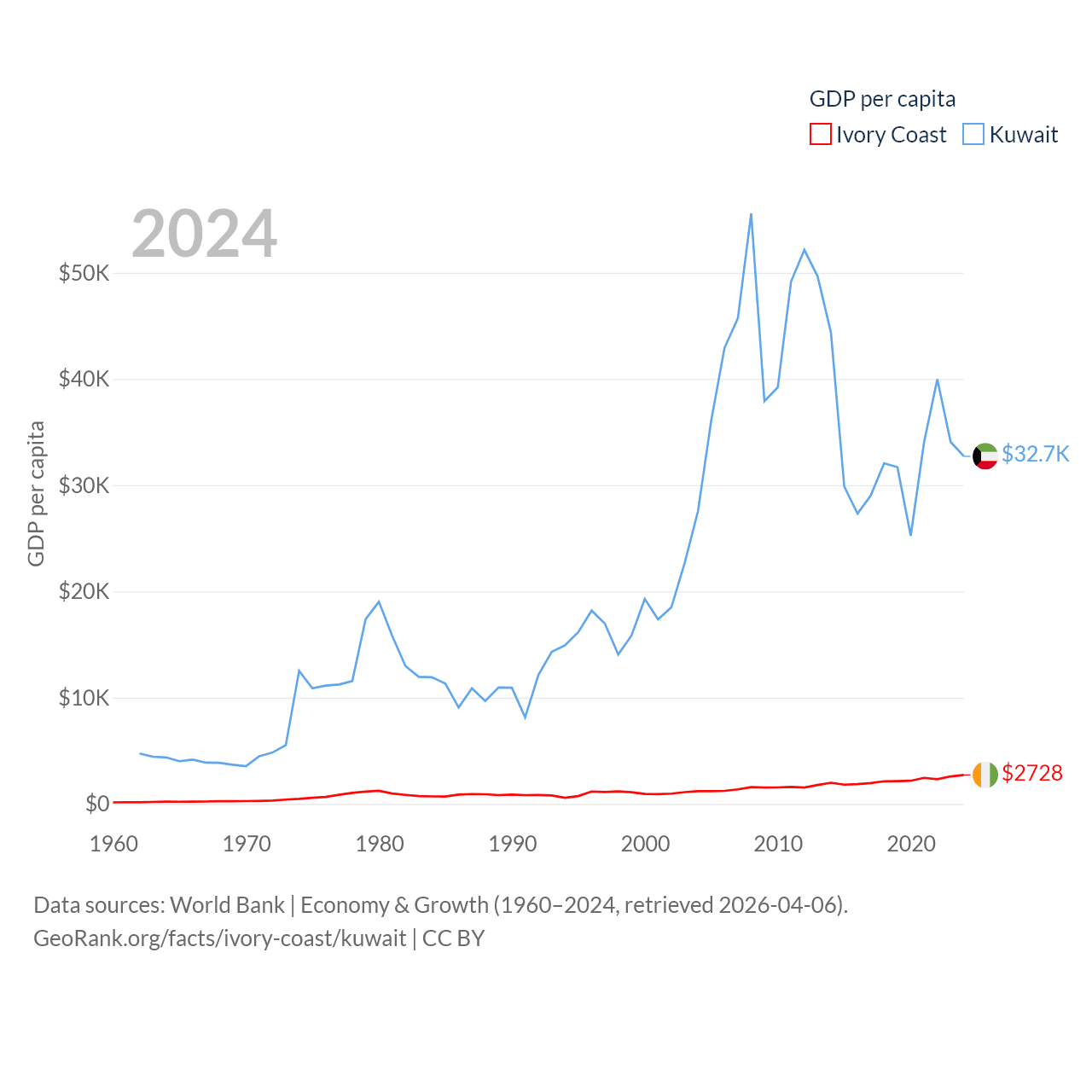 By GDP, Ivory Coast ranks 77/197 ($87.1B) and Kuwait ranks 59/197 ($160B). By GDP per capita, Ivory Coast ranks 142/197 ($2,728), while Kuwait ranks 37/197 ($32,718).
