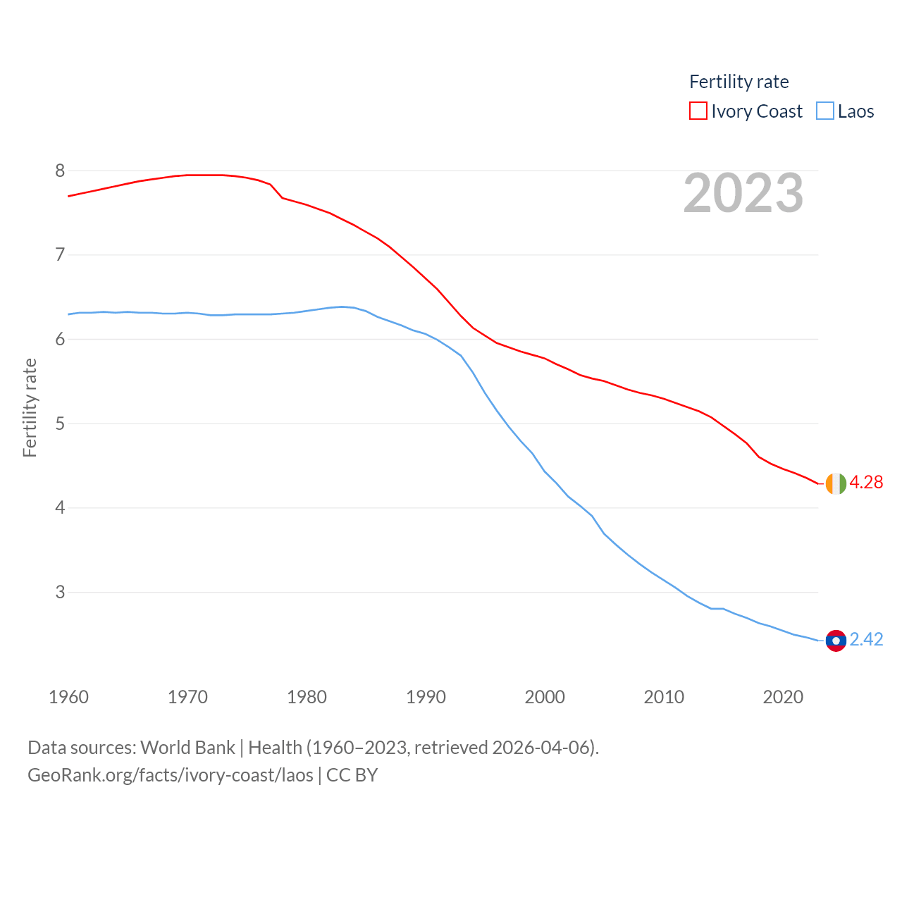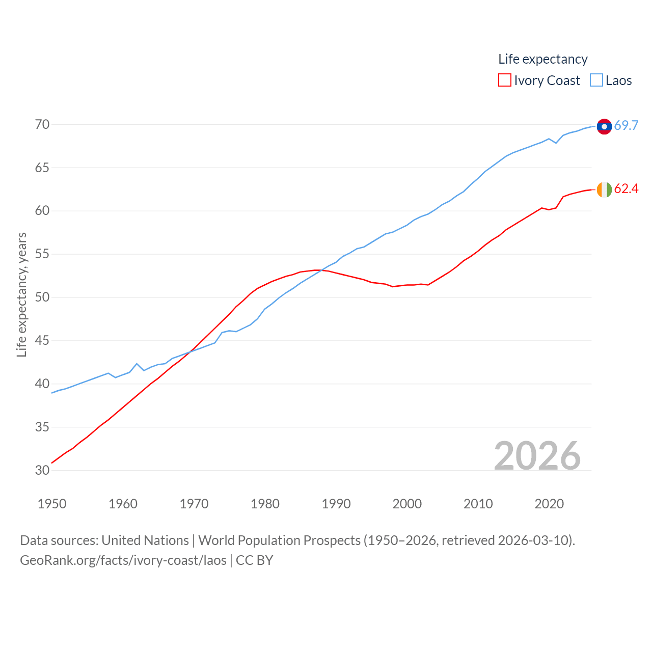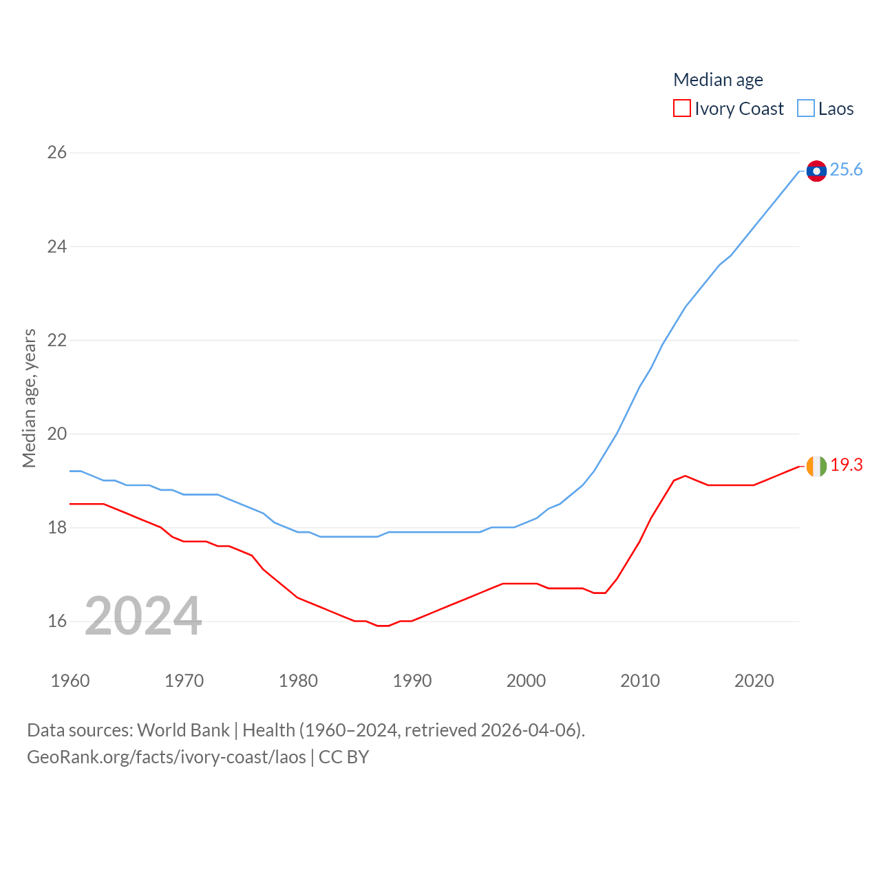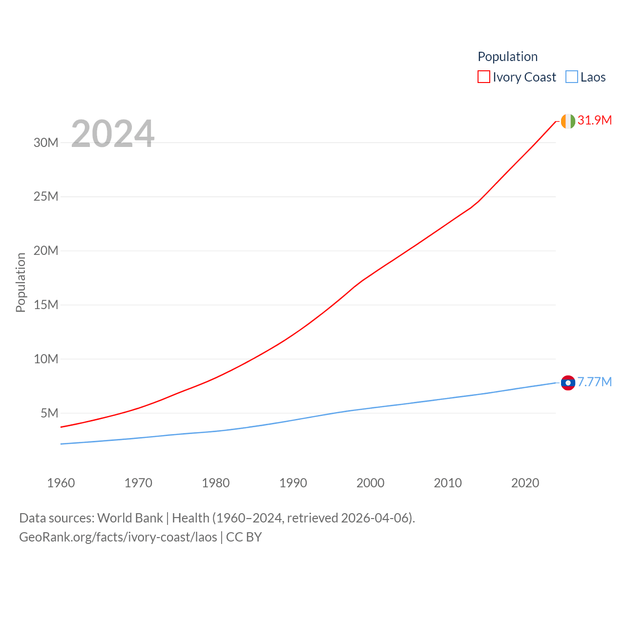 Ivory Coast has a population of 31.9M (ranked 50/197), compared with 7.77M in Laos (ranked 103/197). Ivory Coast's land area is 122,780 sq mi versus 89,112 sq mi for Laos (ranked 66th vs. 79th).