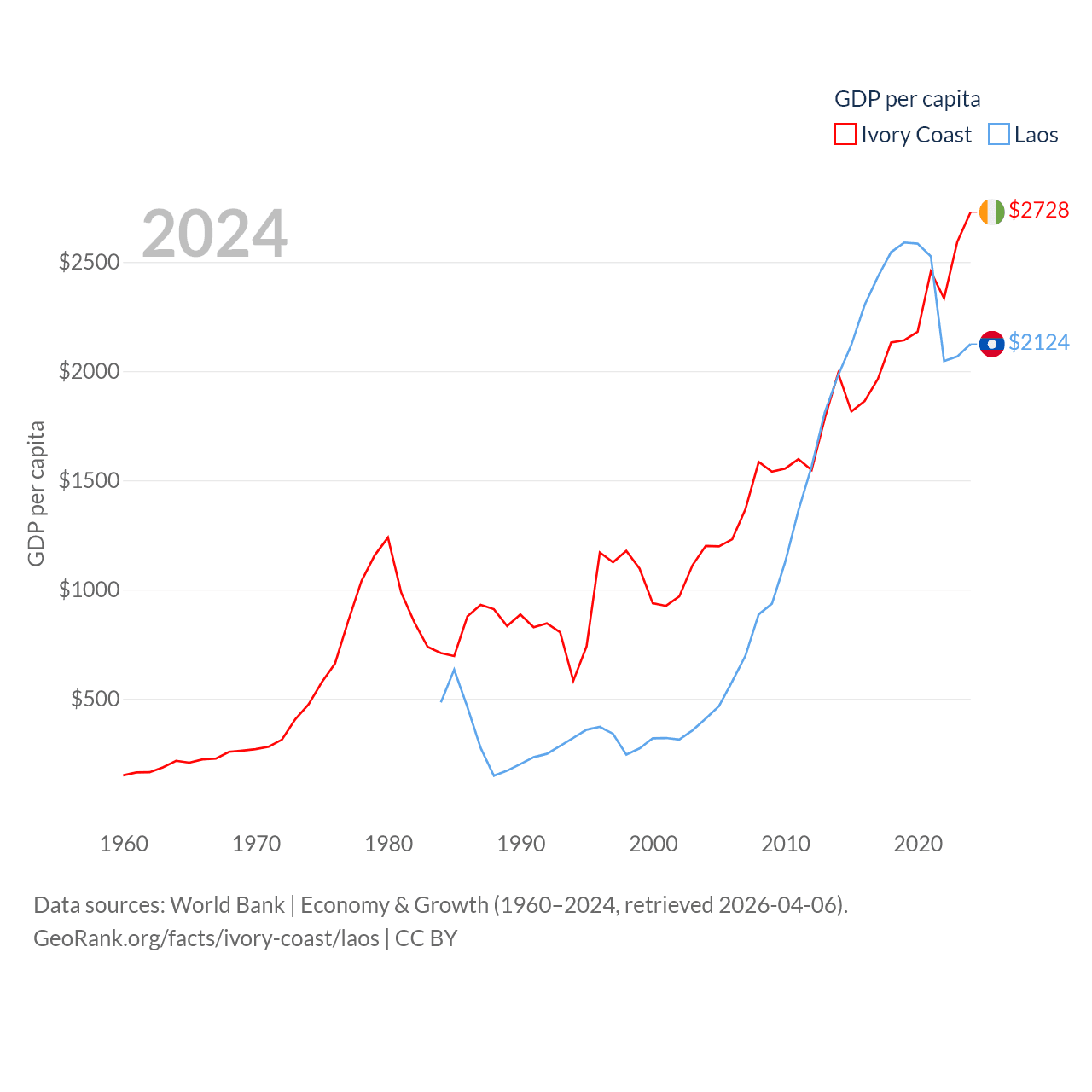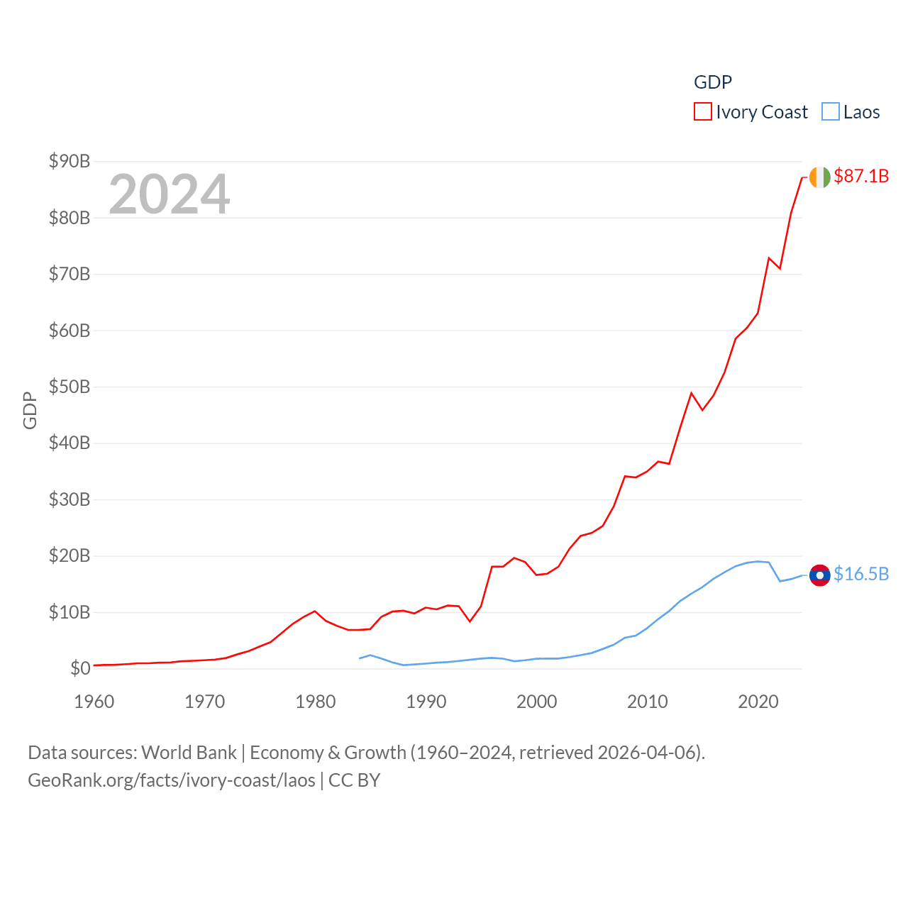 By GDP, Ivory Coast ranks 77/197 ($87.1B) and Laos ranks 139/197 ($16.5B). By GDP per capita, Ivory Coast ranks 142/197 ($2,728), while Laos ranks 155/197 ($2,124).