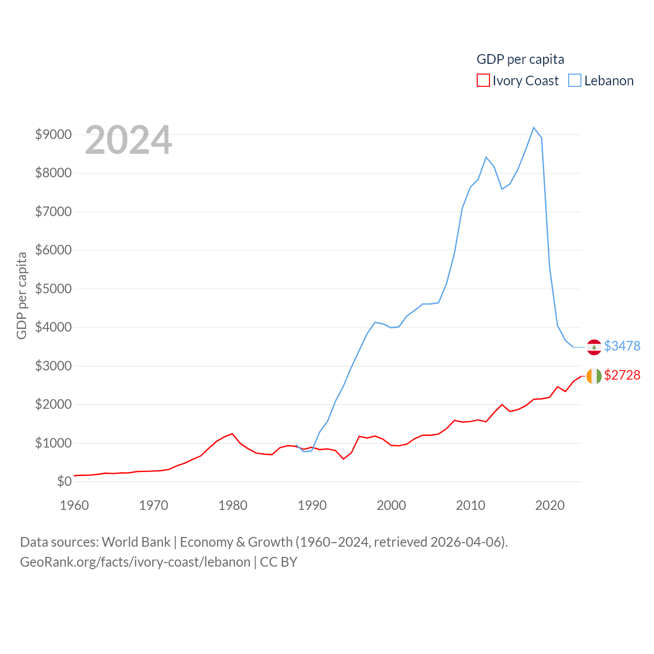 By GDP, Ivory Coast ranks 77/197 ($87.1B) and Lebanon ranks 128/197 ($20.1B). By GDP per capita, Ivory Coast ranks 142/197 ($2,728), while Lebanon ranks 135/197 ($3,478).