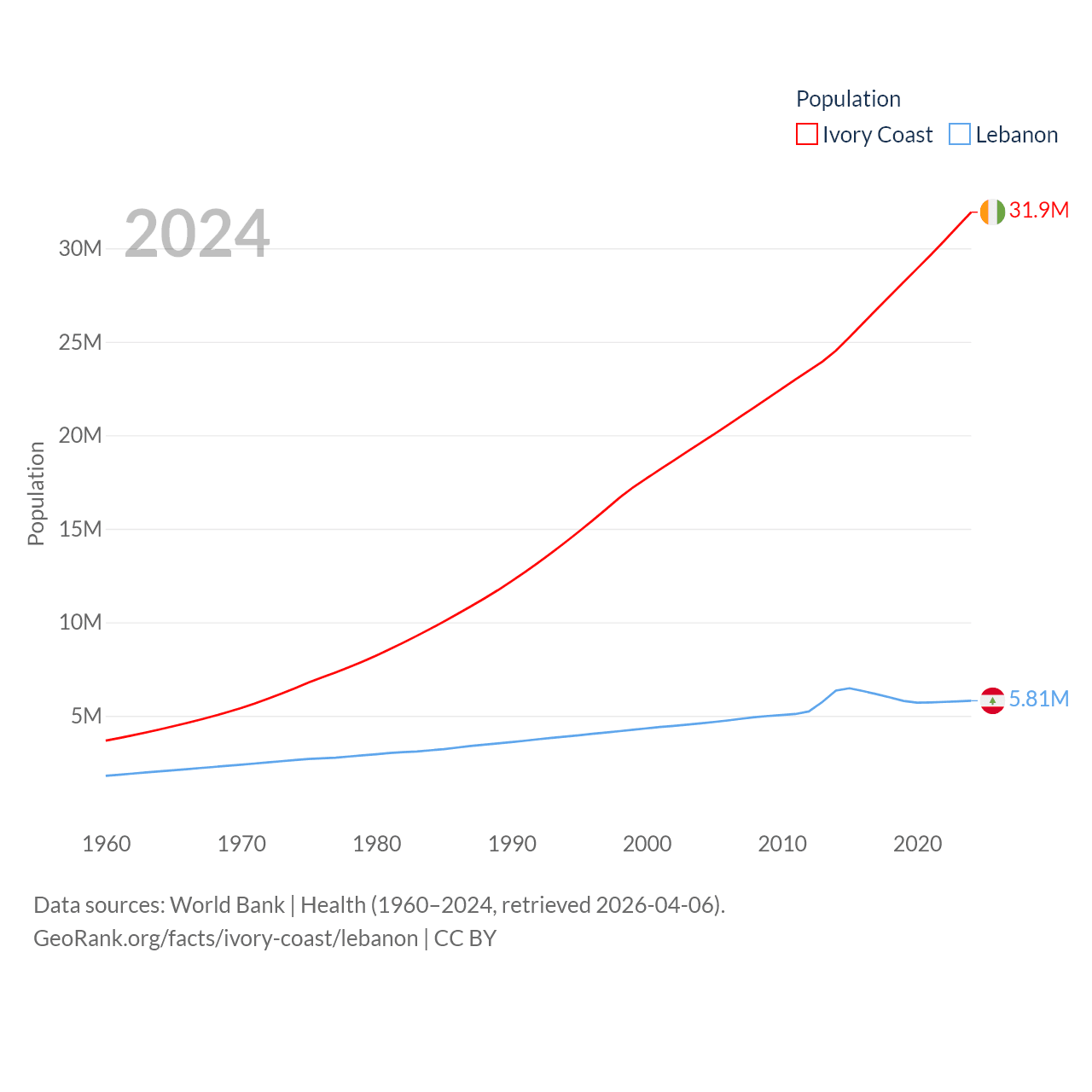 Ivory Coast has a population of 31.9M (ranked 50/197), compared with 5.81M in Lebanon (ranked 115/197). Ivory Coast's land area is 122,780 sq mi versus 3,950 sq mi for Lebanon (ranked 66th vs. 160th).