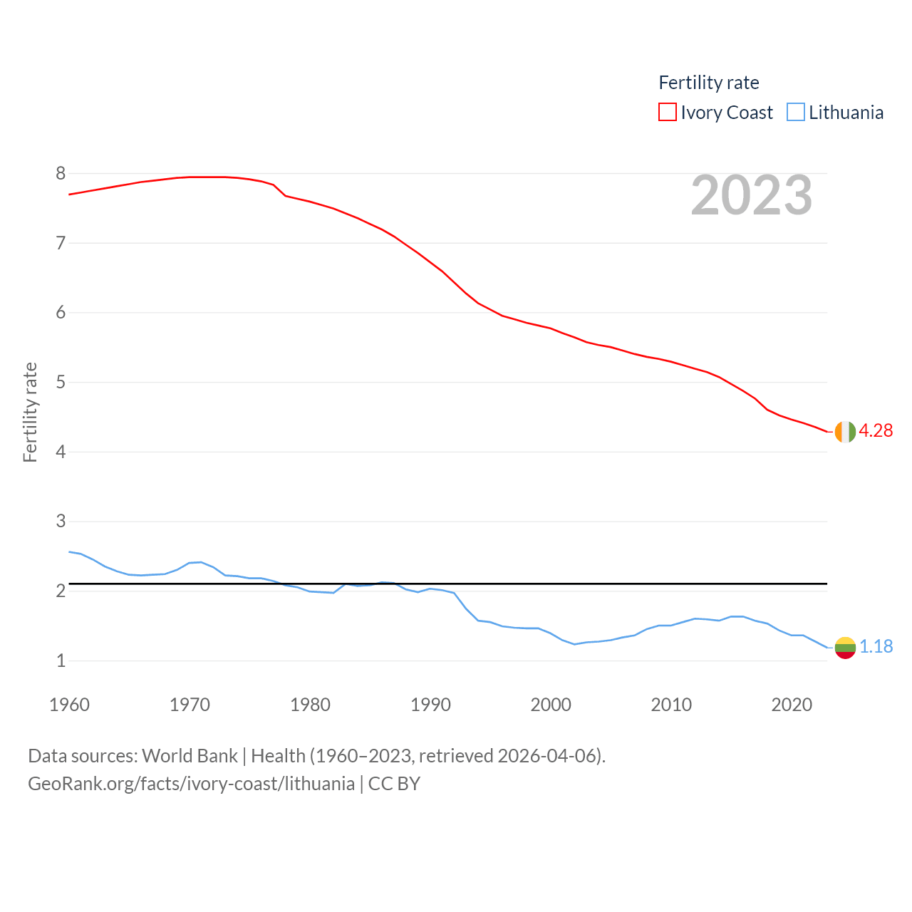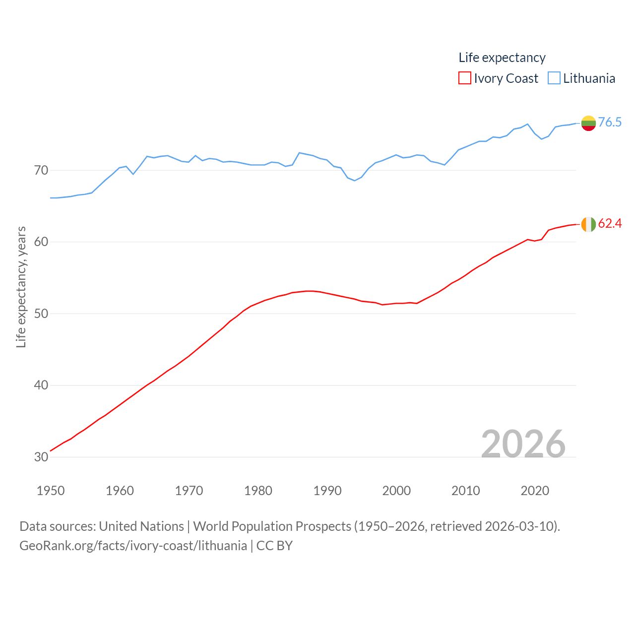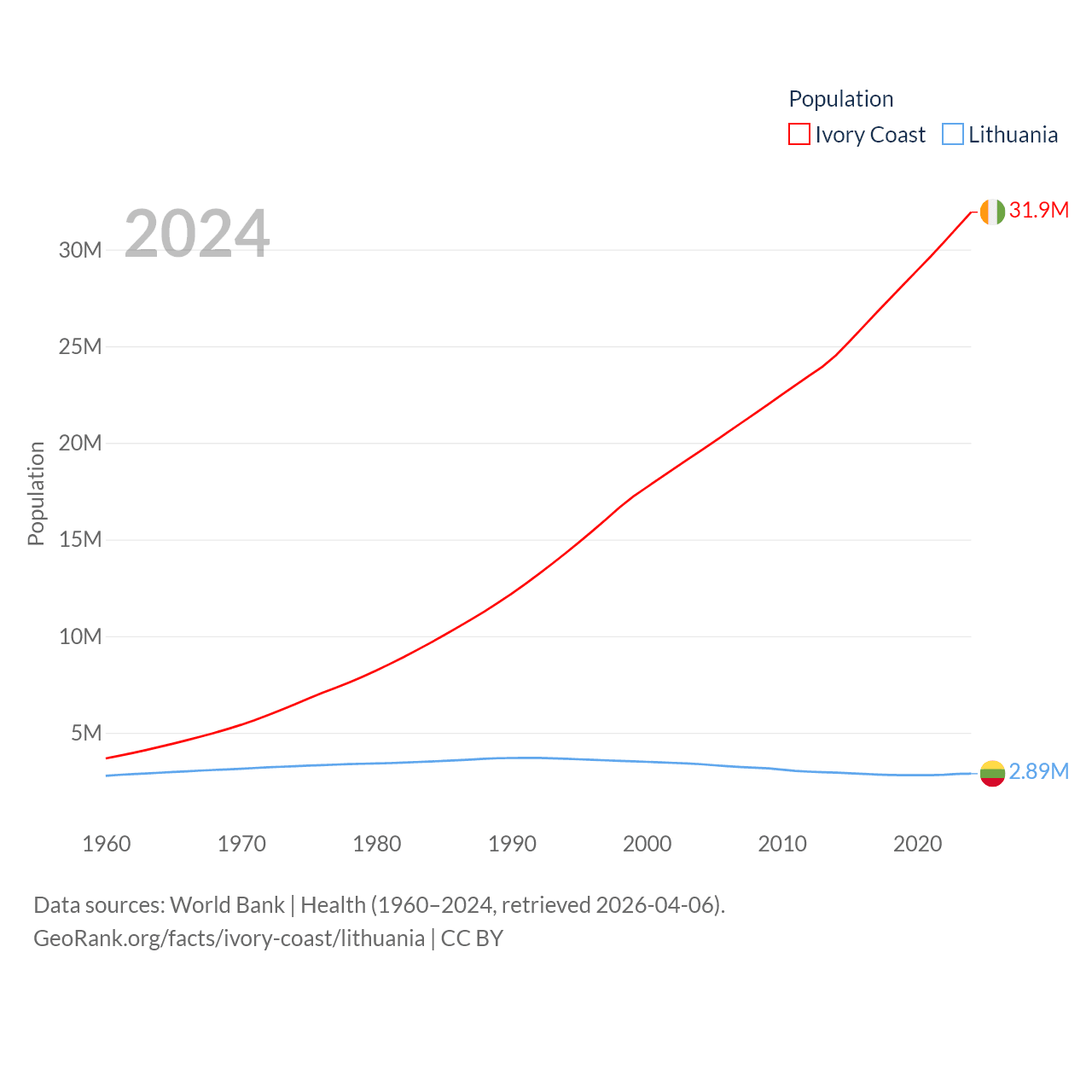 Ivory Coast has a population of 31.9M (ranked 50/197), compared with 2.89M in Lithuania (ranked 137/197). Ivory Coast's land area is 122,780 sq mi versus 24,170 sq mi for Lithuania (ranked 66th vs. 120th).