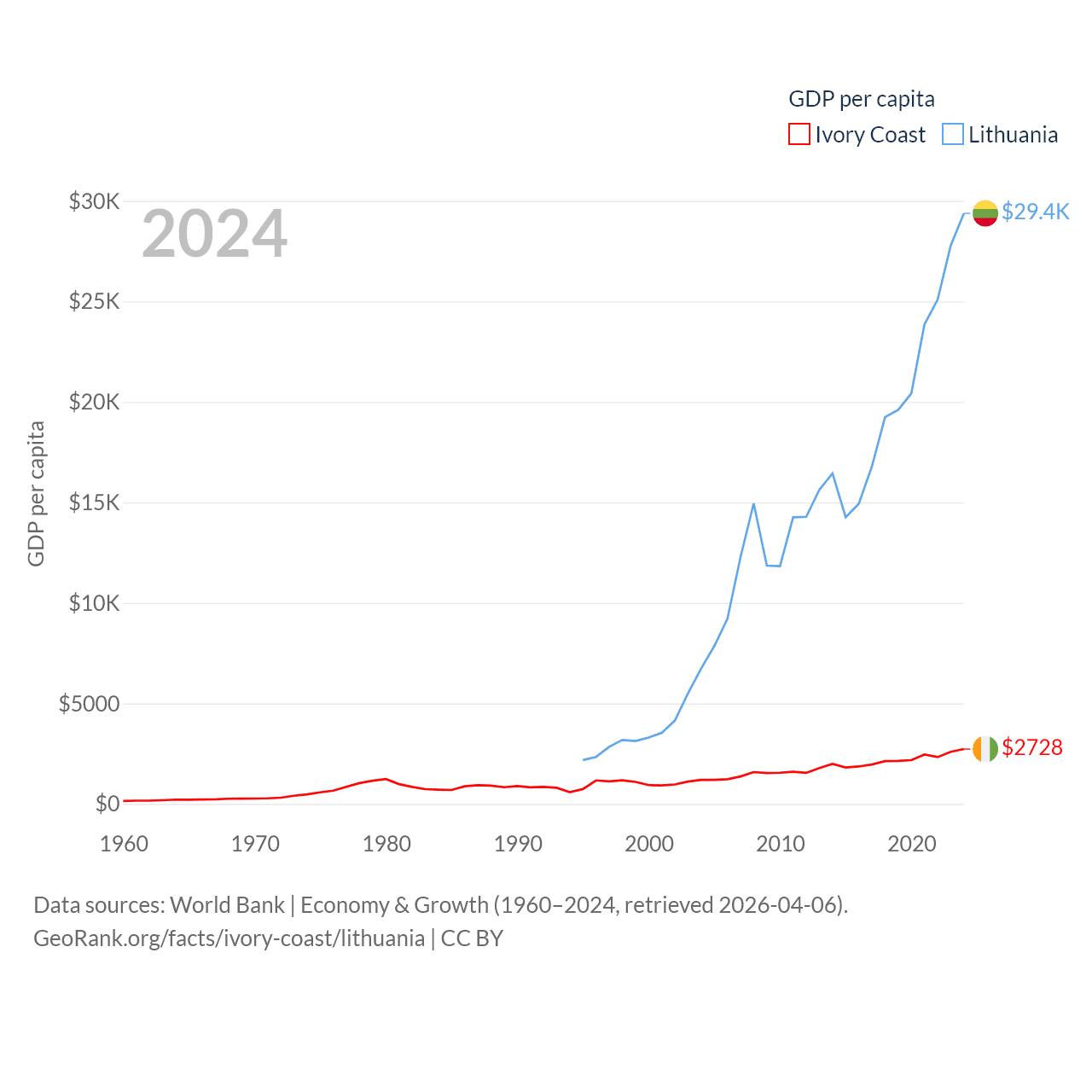 By GDP, Ivory Coast ranks 77/197 ($87.1B) and Lithuania ranks 79/197 ($84.9B). By GDP per capita, Ivory Coast ranks 142/197 ($2,728), while Lithuania ranks 43/197 ($29,384).