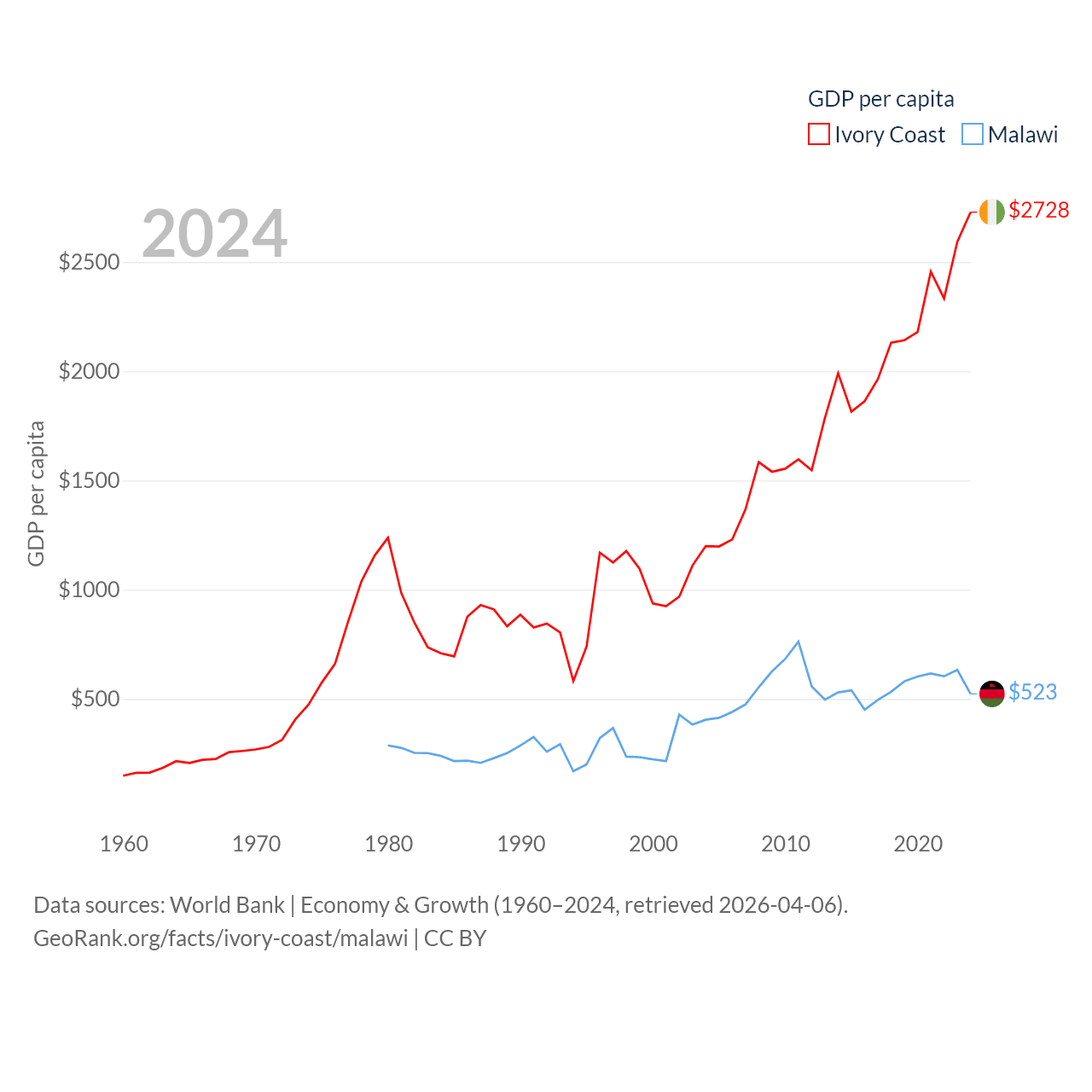 By GDP, Ivory Coast ranks 77/197 ($87.1B) and Malawi ranks 151/197 ($11.3B). By GDP per capita, Ivory Coast ranks 142/197 ($2,728), while Malawi ranks 194/197 ($523).