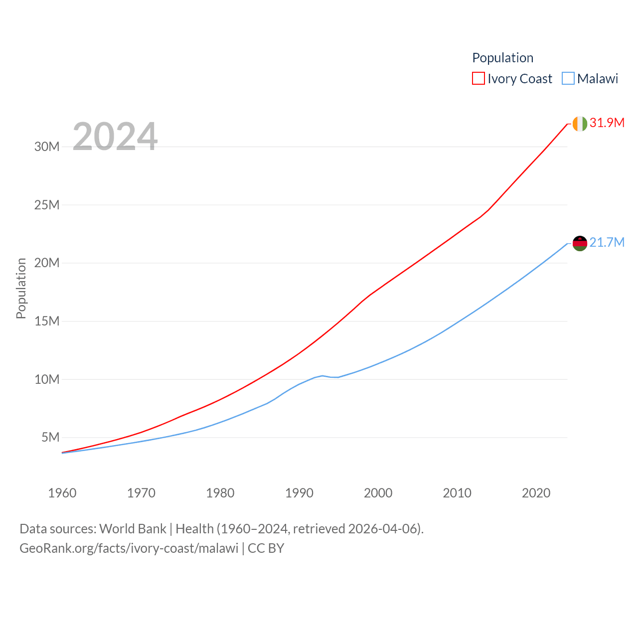 Ivory Coast has a population of 31.9M (ranked 50/197), compared with 21.7M in Malawi (ranked 62/197). Ivory Coast's land area is 122,780 sq mi versus 36,402 sq mi for Malawi (ranked 66th vs. 107th).