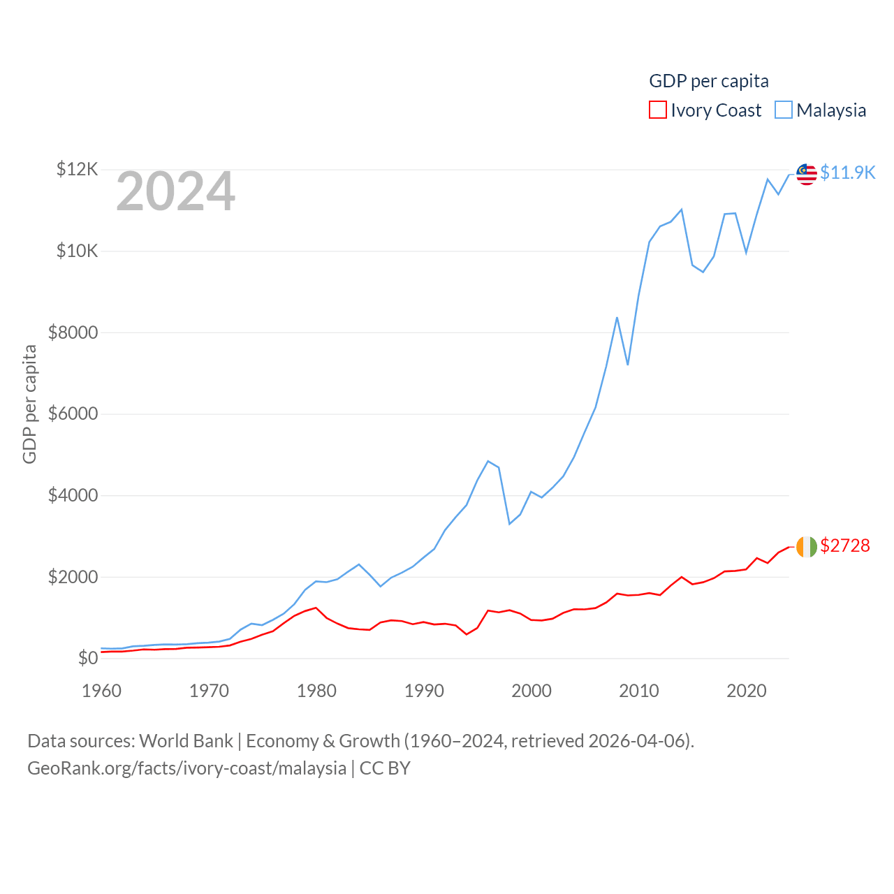 By GDP, Ivory Coast ranks 77/197 ($87.1B) and Malaysia ranks 38/197 ($422B). By GDP per capita, Ivory Coast ranks 142/197 ($2,728), while Malaysia ranks 79/197 ($11,874).