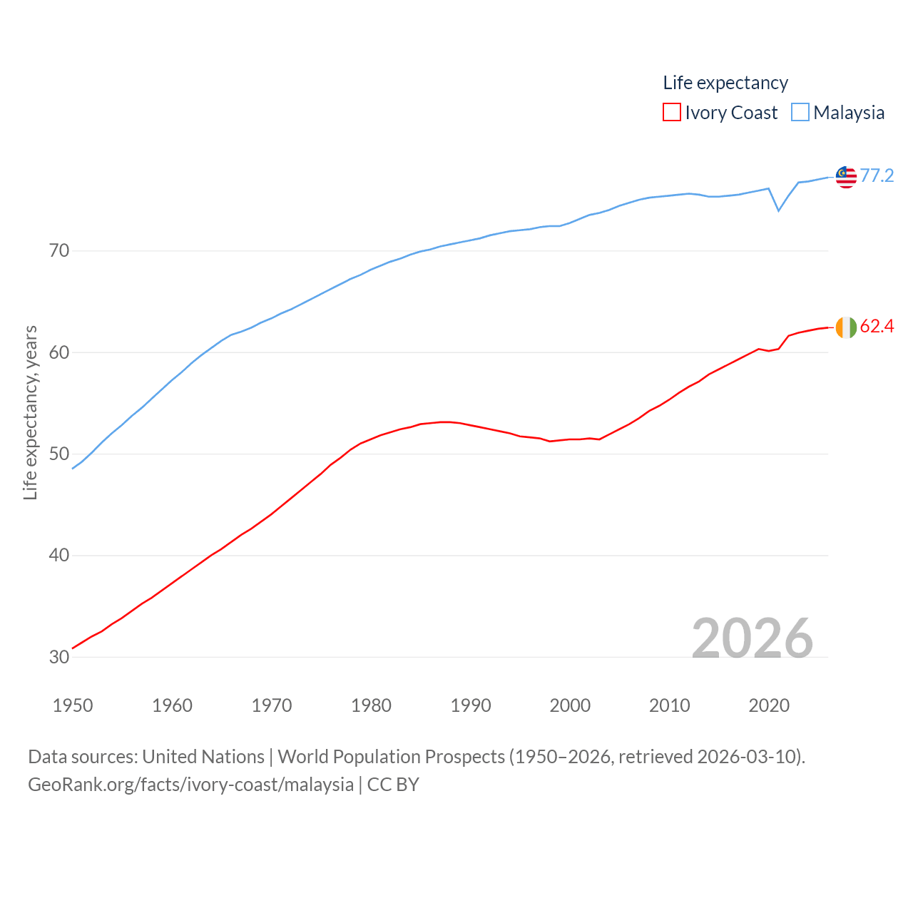 Ivory Coast has a population of 31.9M (ranked 50/197), compared with 35.6M in Malaysia (ranked 44/197). Ivory Coast's land area is 122,780 sq mi versus 126,854 sq mi for Malaysia (ranked 66th vs. 65th).