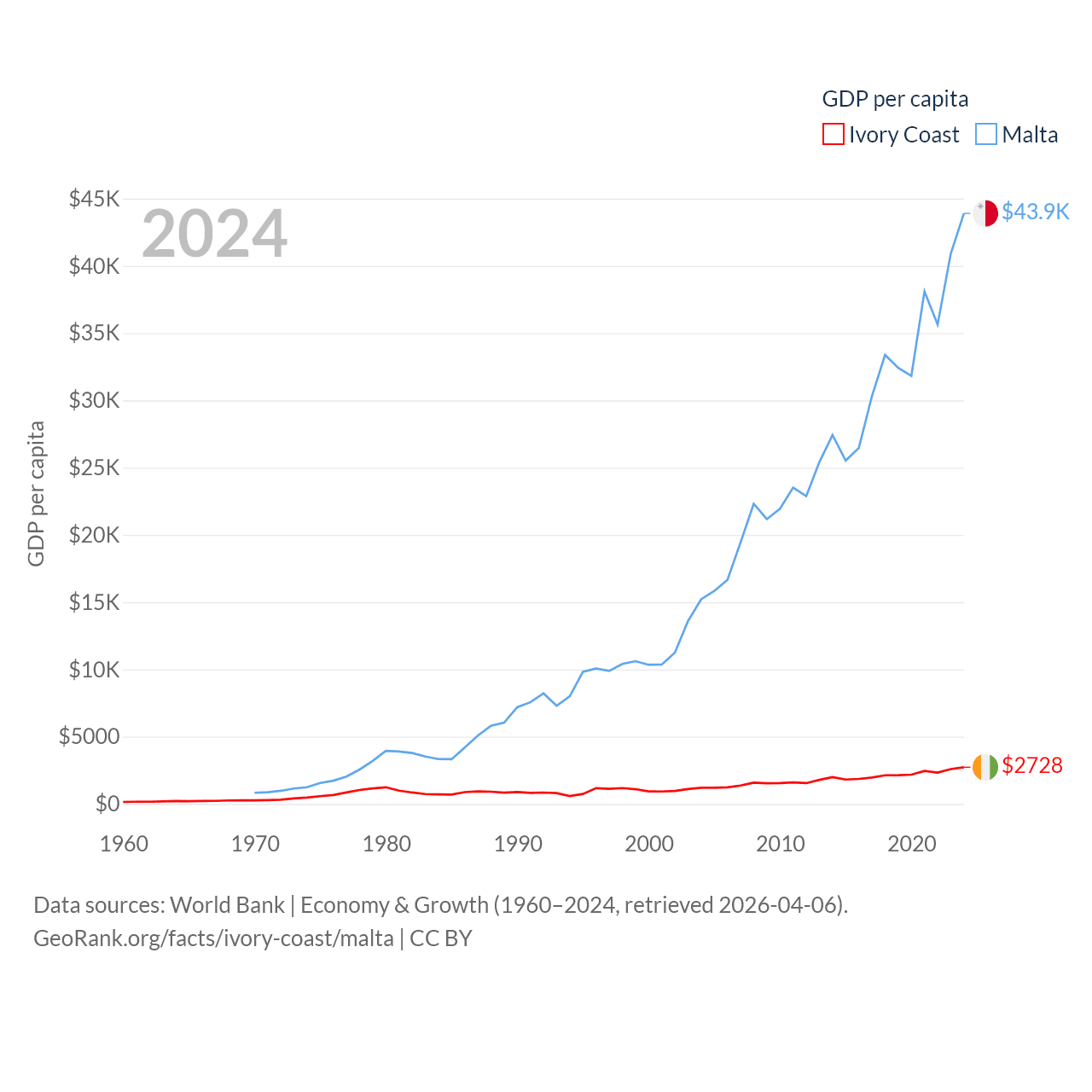 By GDP, Ivory Coast ranks 77/197 ($87.1B) and Malta ranks 119/197 ($25B). By GDP per capita, Ivory Coast ranks 142/197 ($2,728), while Malta ranks 28/197 ($43,899).