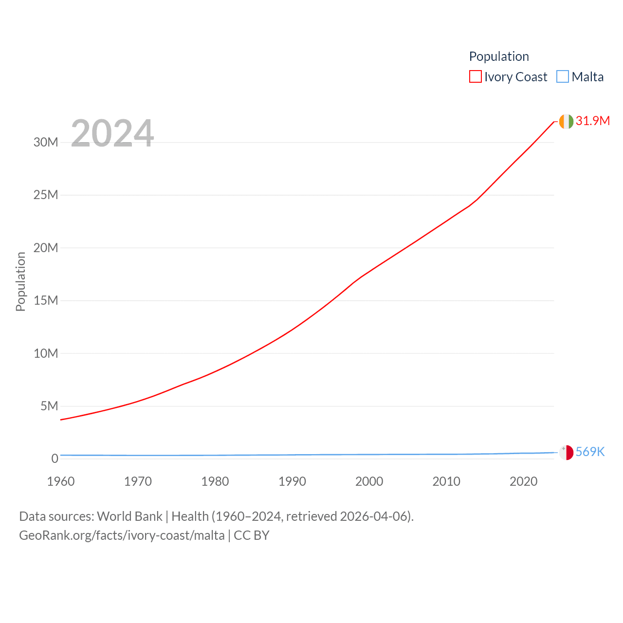 Ivory Coast has a population of 31.9M (ranked 50/197), compared with 569K in Malta (ranked 167/197). Ivory Coast's land area is 122,780 sq mi versus 123.6 sq mi for Malta (ranked 66th vs. 187th).