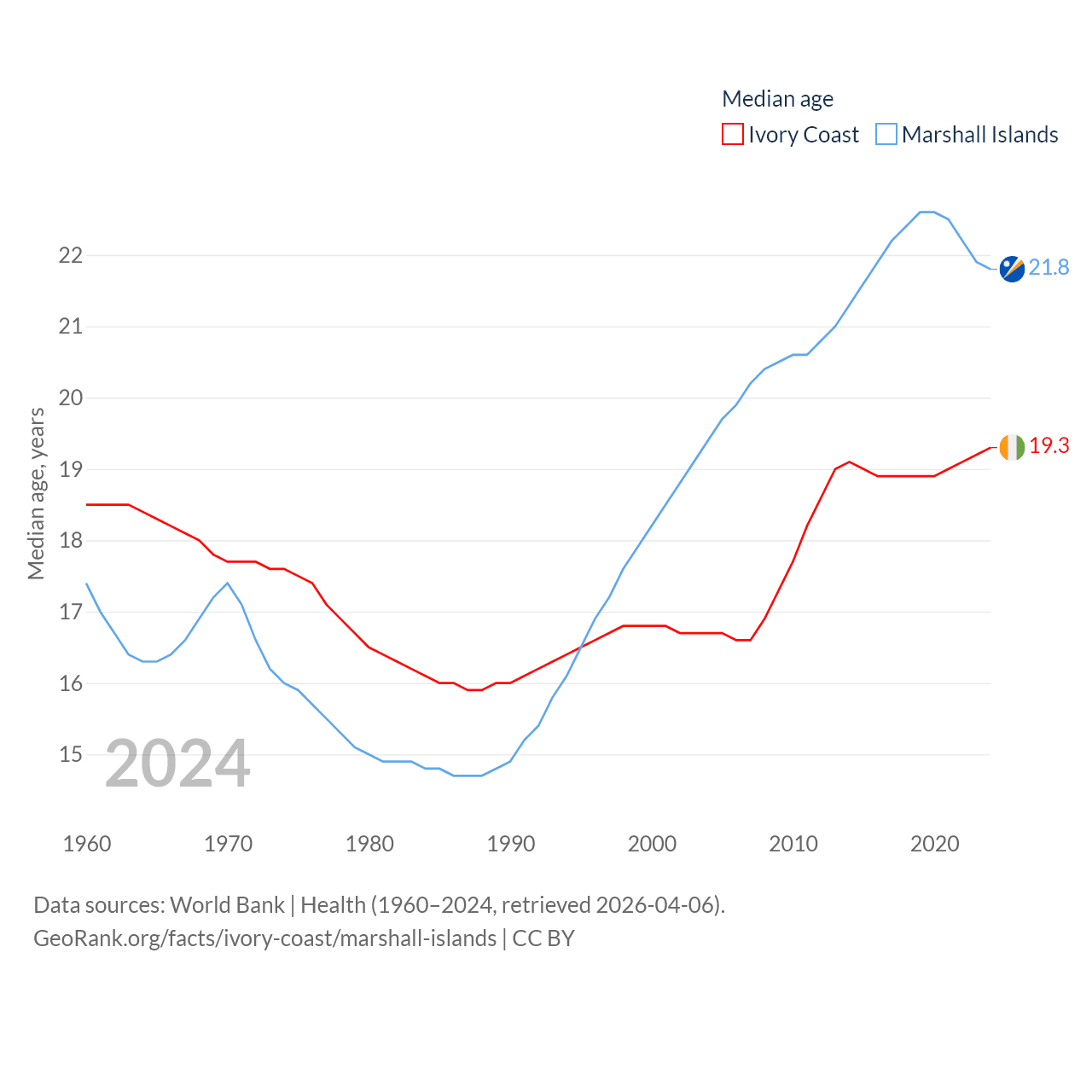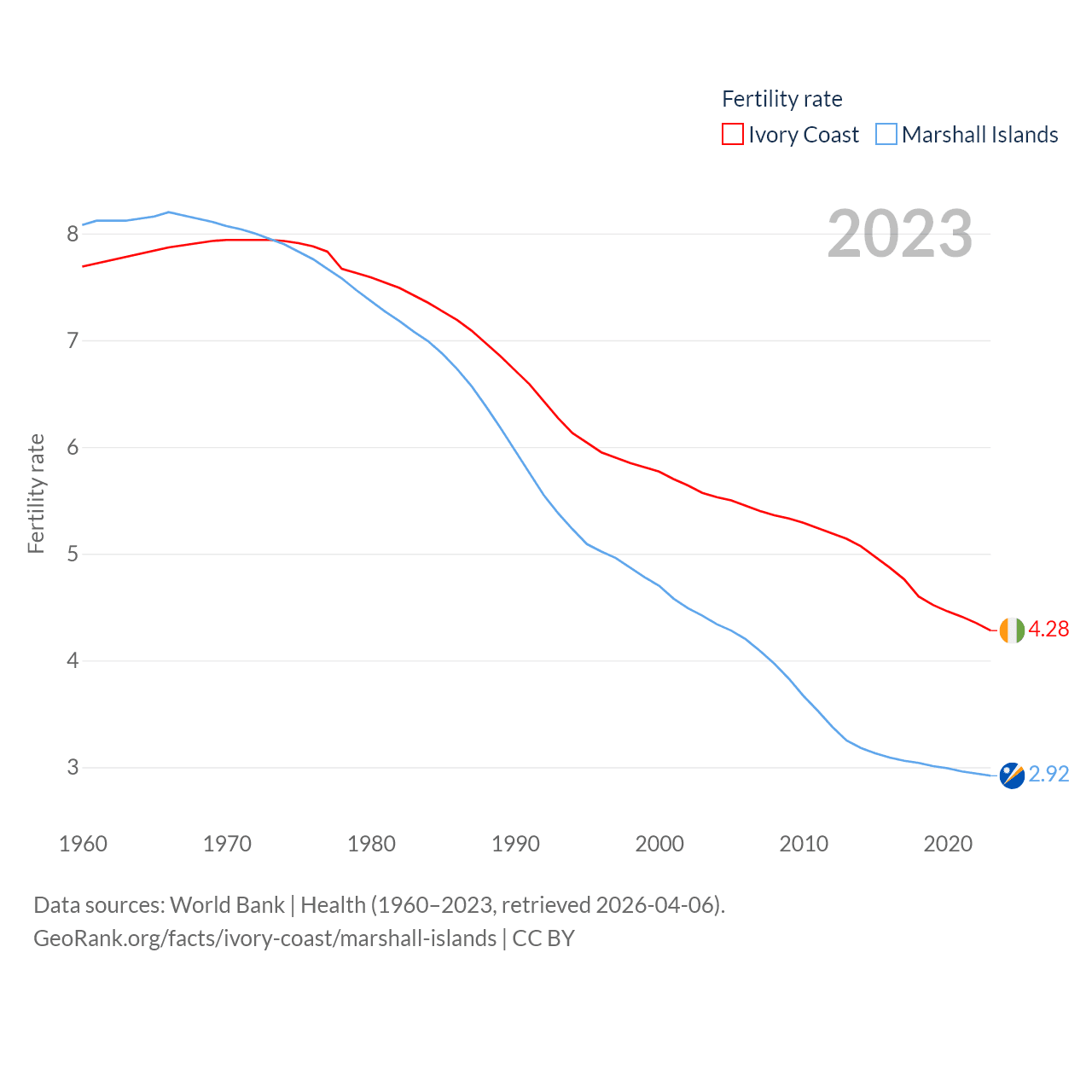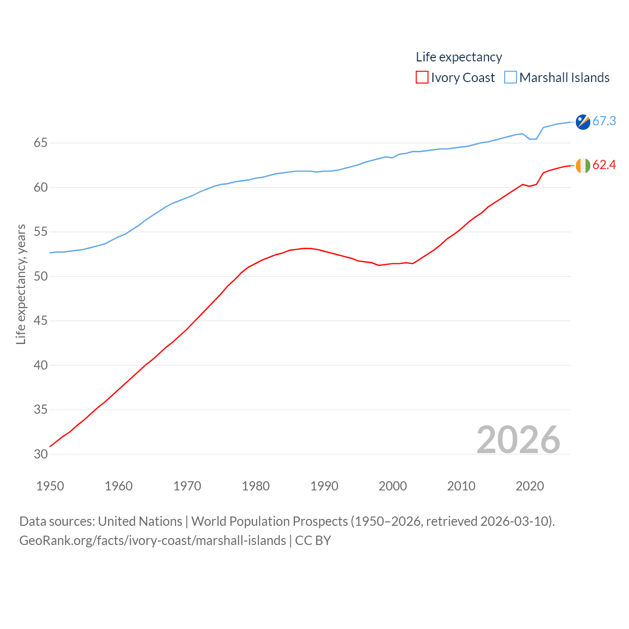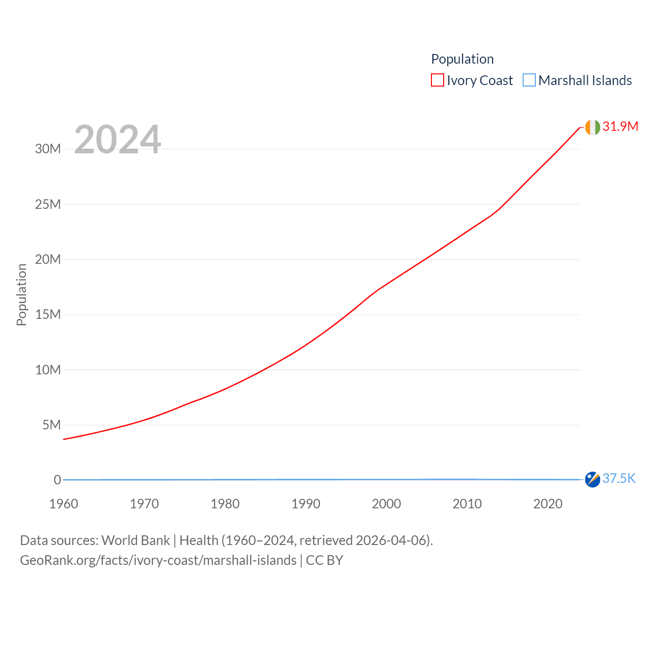 Ivory Coast has a population of 31.9M (ranked 50/197), compared with 37.5K in The Marshall Islands (ranked 192/197). Ivory Coast's land area is 122,780 sq mi versus 69.5 sq mi for The Marshall Islands (ranked 66th vs. 191st).