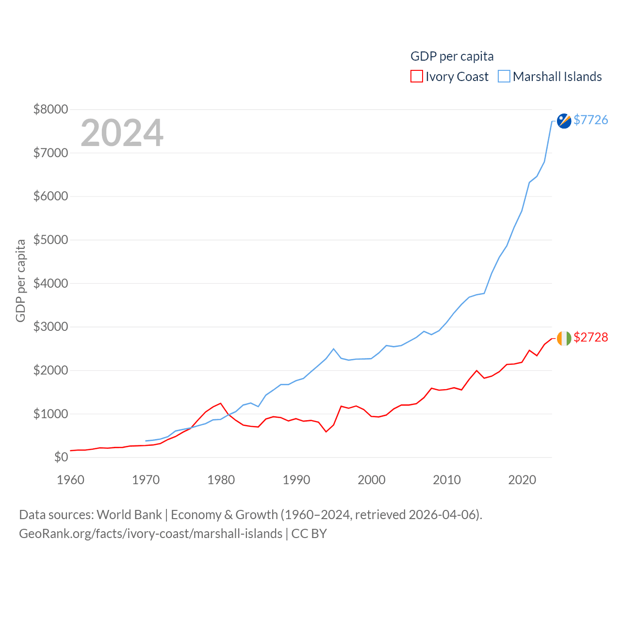By GDP, Ivory Coast ranks 77/197 ($87.1B) and The Marshall Islands ranks 193/197 ($290M). By GDP per capita, Ivory Coast ranks 142/197 ($2,728), while The Marshall Islands ranks 96/197 ($7,726).