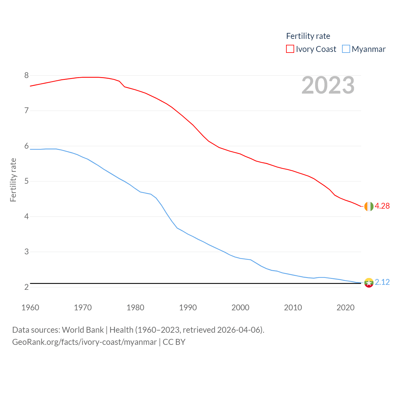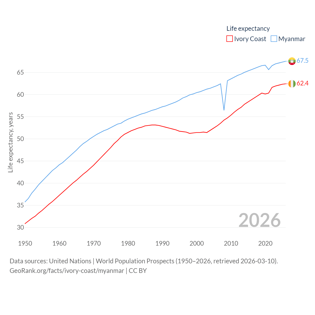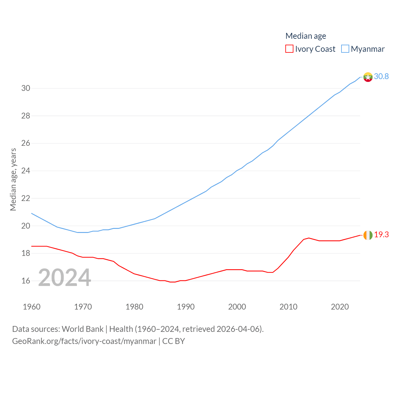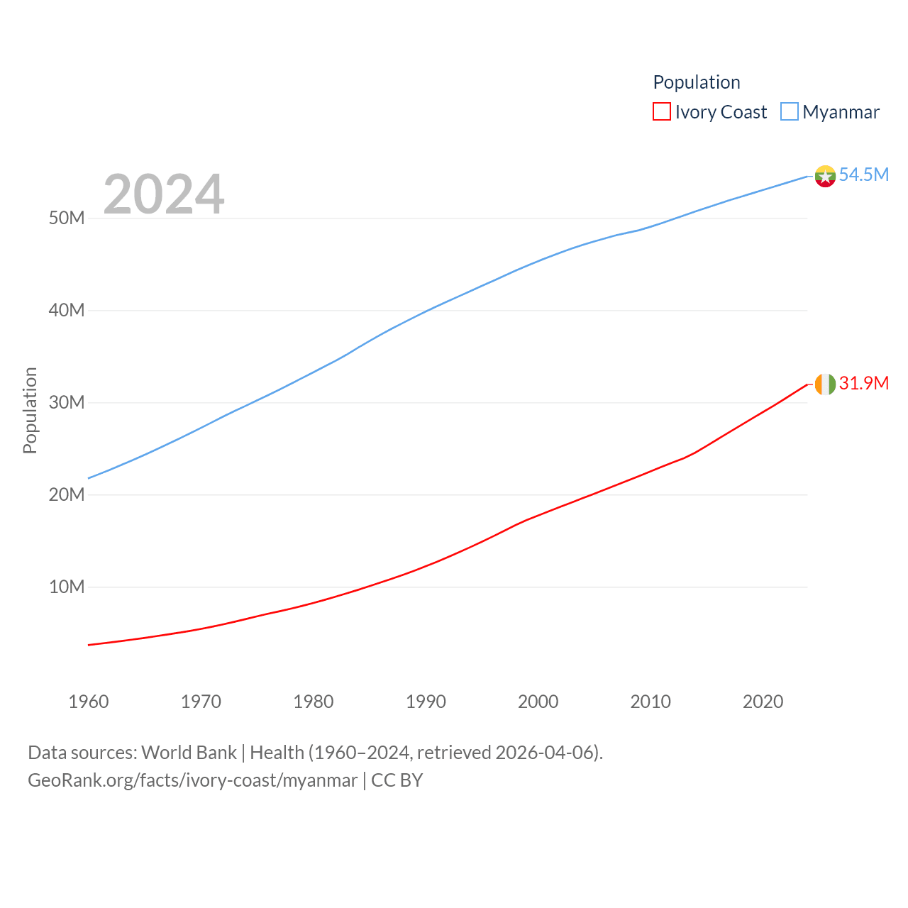 Ivory Coast has a population of 31.9M (ranked 50/197), compared with 54.5M in Myanmar (ranked 27/197). Ivory Coast's land area is 122,780 sq mi versus 251,997 sq mi for Myanmar (ranked 66th vs. 39th).